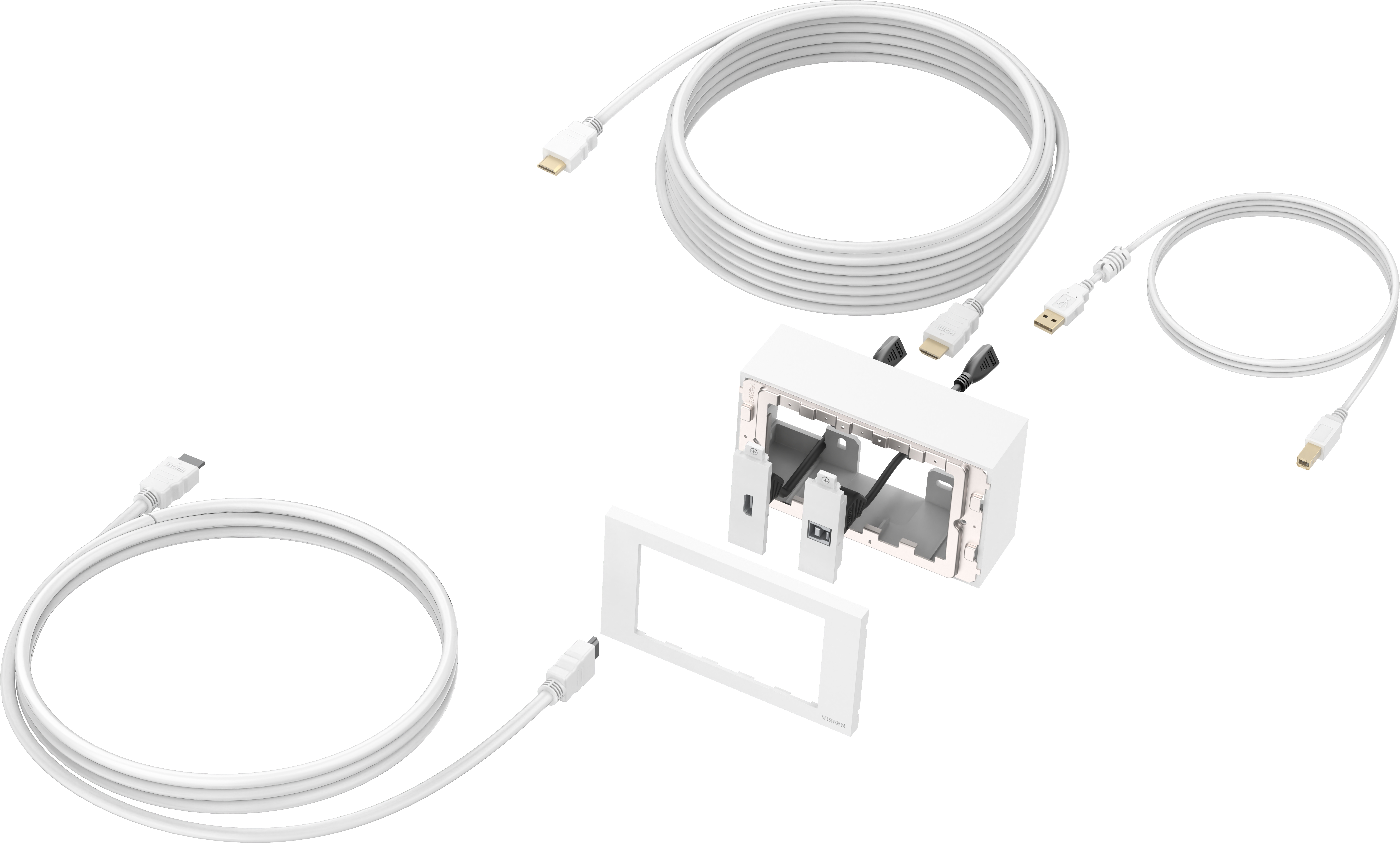 Vision TC3-PK3M. Type de douille: HDMI + USB Type-B, Quantité de modules (max): 2 module(s), Version USB: USB 3.2 Gen 1 (3.1 Gen 1). Couleur du produit: Blanc, Matériau du boîtier/corps: Acrylonitrile-Butadiène-Styrène (ABS), Polycarbonate (PC), Longueur de câble: 3 m. Largeur: 86 mm, Profondeur: 86 mm, Hauteur: 45 mm. Largeur du colis: 275 mm, Profondeur du colis: 180 mm, Hauteur du colis: 80 mm. Pays d'origine: Chine