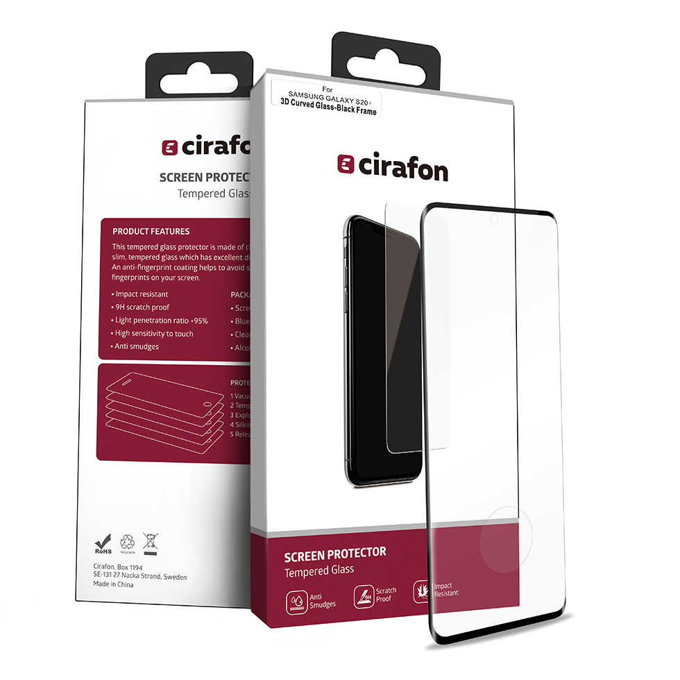 Cirafon CG-ASOD-SMS20+. Compatibilité de marque: Samsung, Compatibilité: Galaxy S20+, Fonctions de protection: Résistant à la saleté, Résistant à la poussière, Résistant aux rayures. Finition de surface: Brillant, Matériel: Verre trempé, Couleur du produit: Transparent. Quantité: 1 pièce(s)