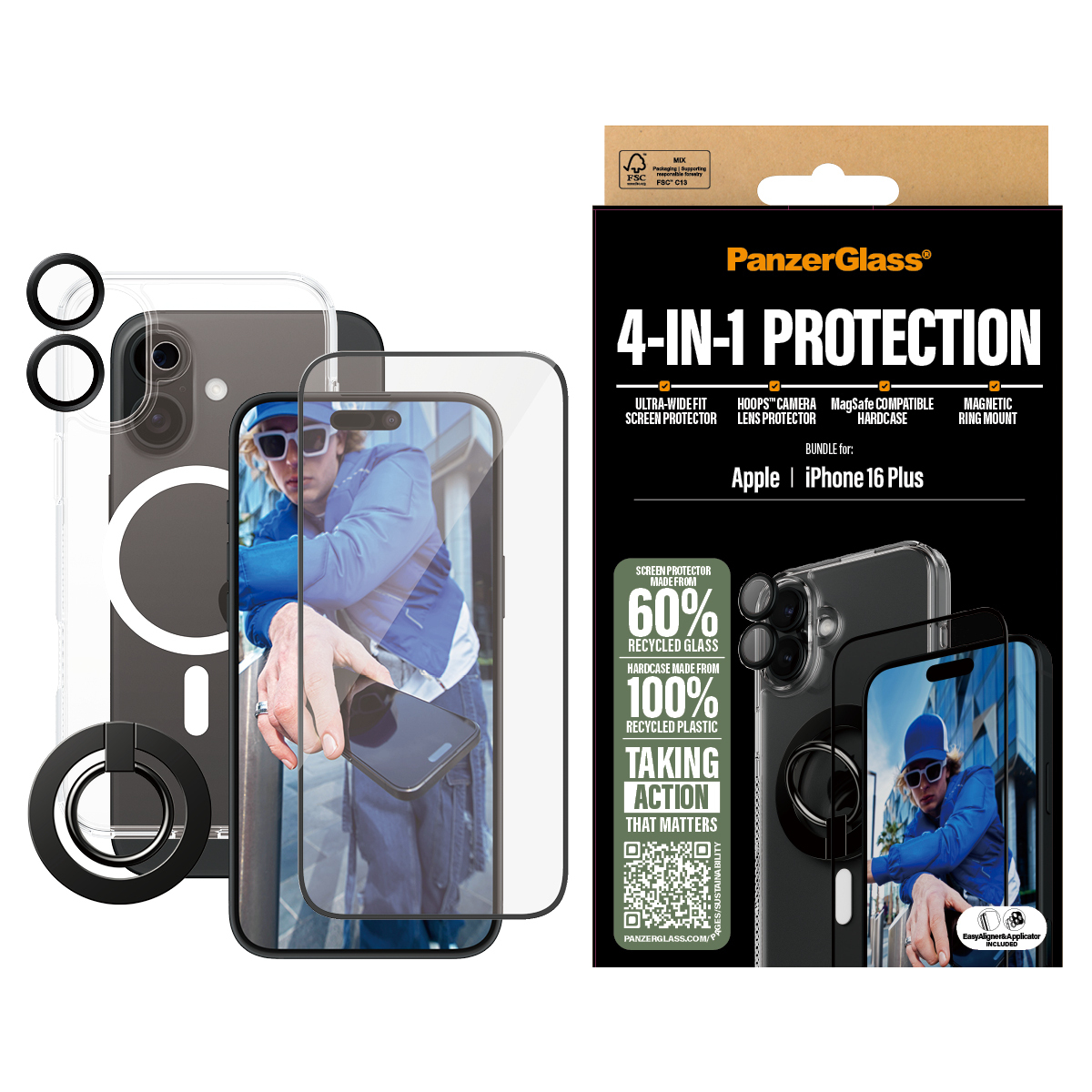 PanzerGlass ® 4-in-1 Protection Bundle iPhone 16 Plus, Apple, Apple - iPhone 16 Plus, Application à sec, Résistant aux rayures, Résistant aux chocs, Transparent, 1 pièce(s)