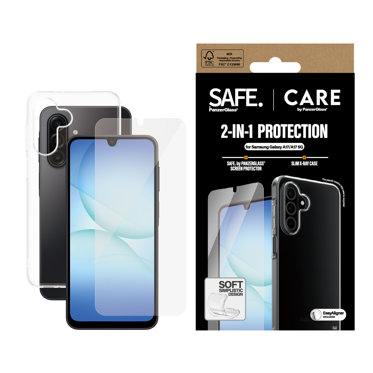 PanzerGlass SAFE. | CARE™ by ® 2-in-1 Bundle Samsung Galaxy A17 | A17 5G. Compatibilité de marque: Samsung, Compatibilité: Samsung - Galaxy A17 4G, Samsung - Galaxy A17 5G. Application à sec. Fonctions de protection: Résistant aux rayures, Résistant aux chocs. Matériel: Polyuréthane thermoplastique (TPU), Couleur du produit: Transparent. Quantité: 1 pièce(s)