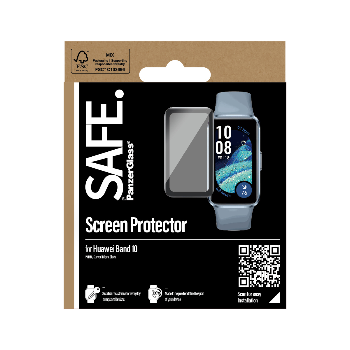 PanzerGlass SAFE. by ® Screen Protector w. Black Frame Huawei Band 10, Huawei, Huawei - Band 10, Application à sec, Résistant aux rayures, Résistant aux chocs, Transparent, 1 pièce(s)