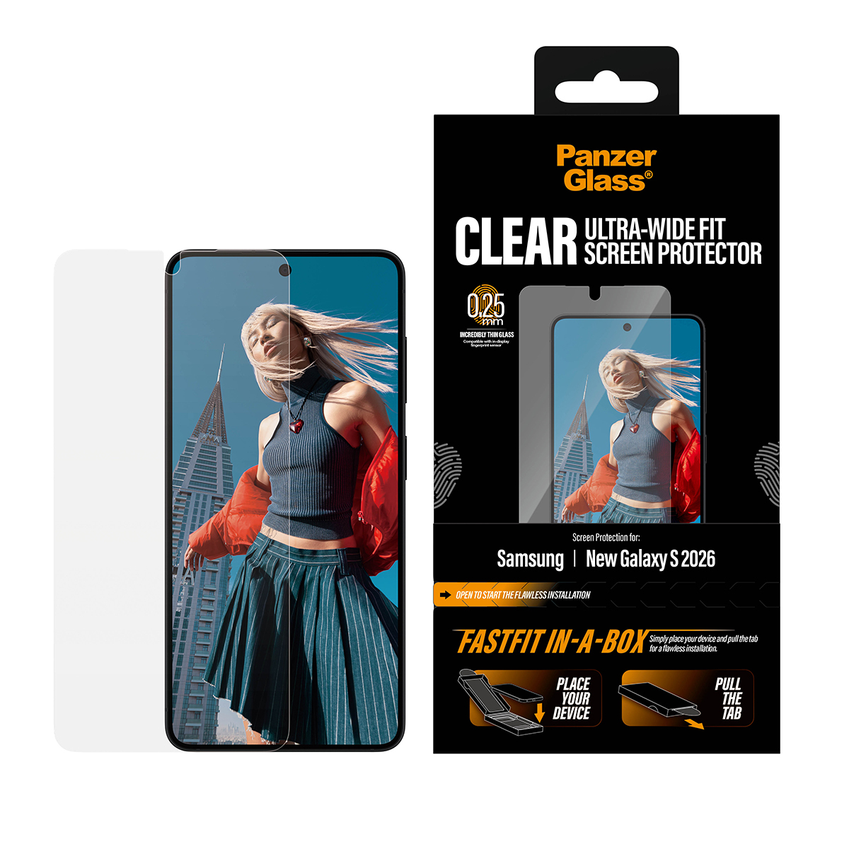 PanzerGlass ® Screen Protector Samsung New Galaxy S 2026 | Ultra-Wide Fit w. FASTFIT IN-A-BOX, Samsung, Samsung - New Galaxy S2026, Application à sec, Résistant aux rayures, Résistant aux chocs, Transparent, 1 pièce(s)