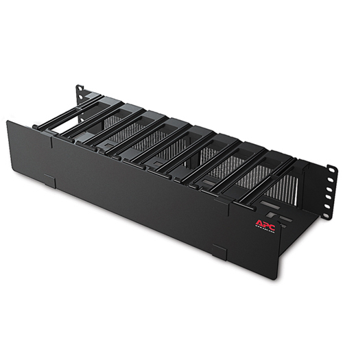 Guide de câblage horizontal haute densité 2U, d'une profondeur de 150 mm (6 in) avec couvercle. Fournit des emplacements d'attache de fils de câbles et emplacements d'accès pour câble dans le fond de panier pour passant d'avant en arrière.