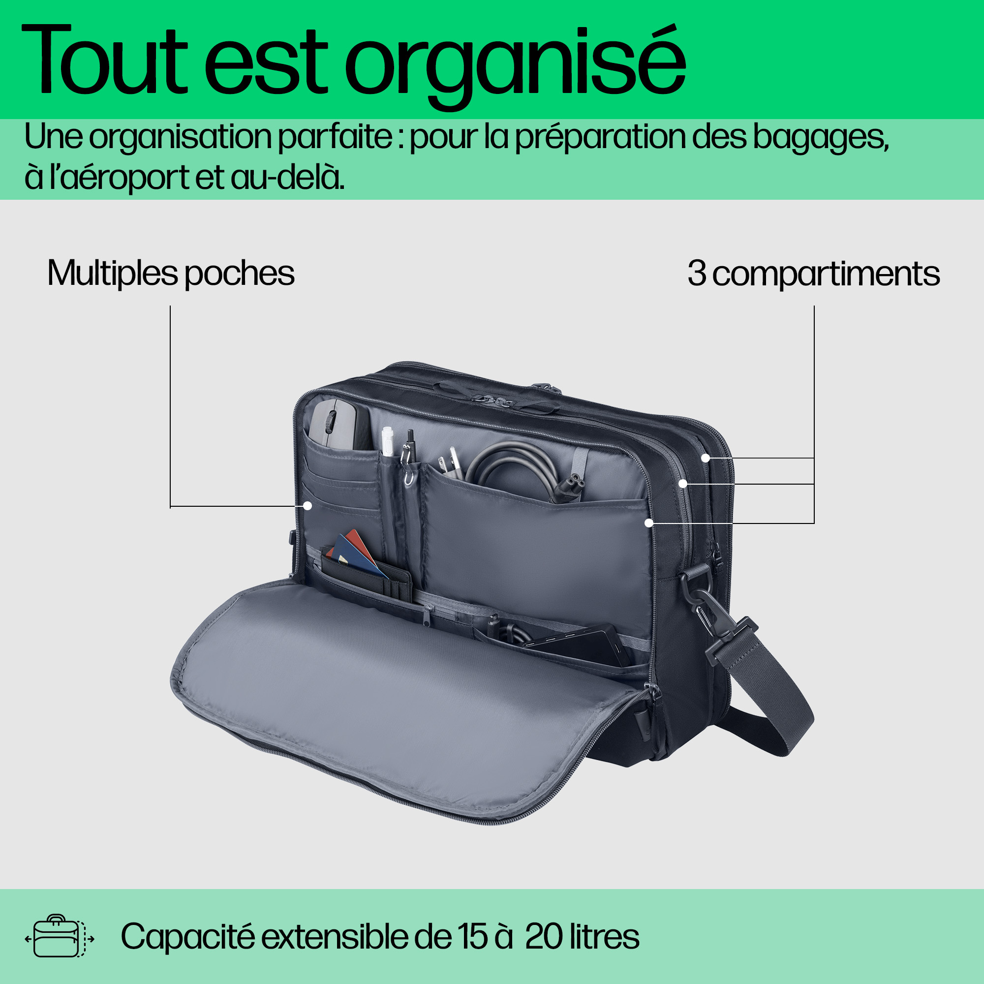 Simplifiez votre déplacement avec un sac qui répond à lui seul à tous vos besoins. Ce sac durable et soigneusement conçu vous offre une organisation parfaite, dans toutes les situations. Plusieurs compartiments facilitent l’accès pour le contrôle de sécurité de l’aéroport.