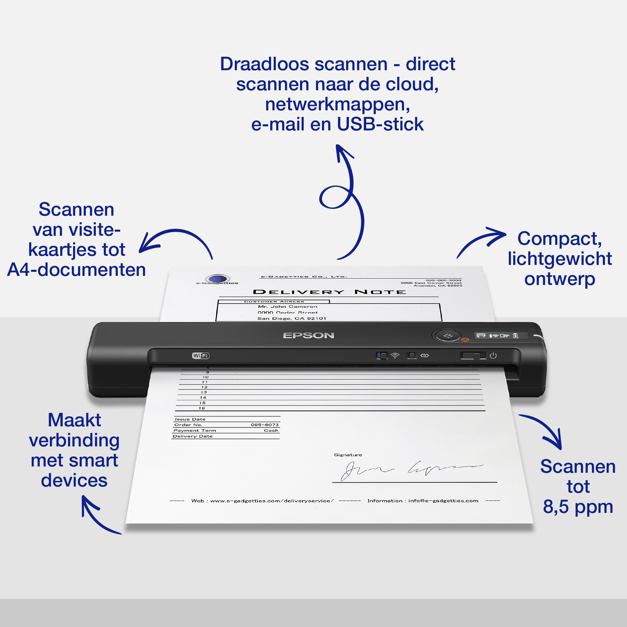 Epson WorkForce ES-60W, 600 x 600 DPI, 48 bit, 24 bit, 16 bit, 8 bit, 4 sec/page