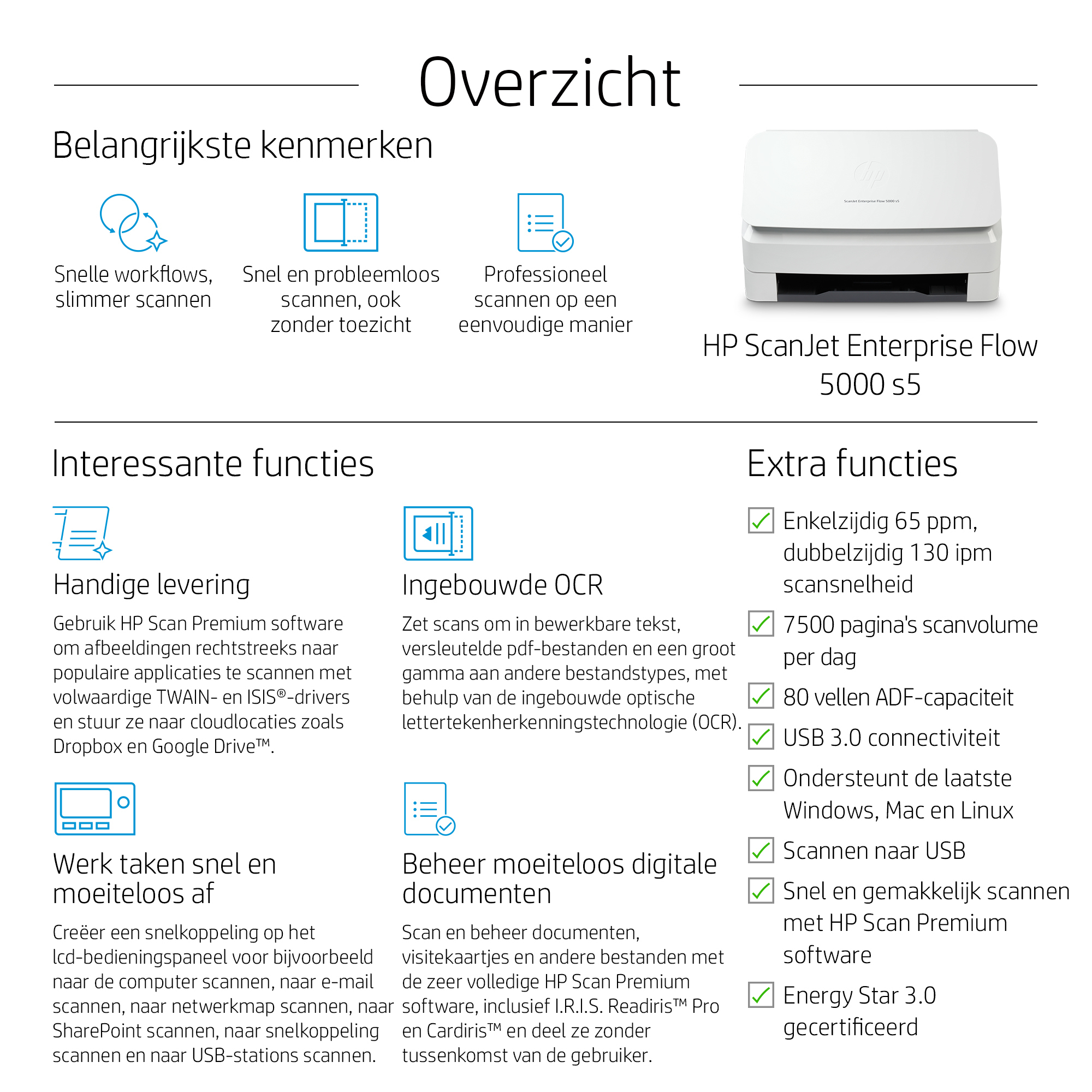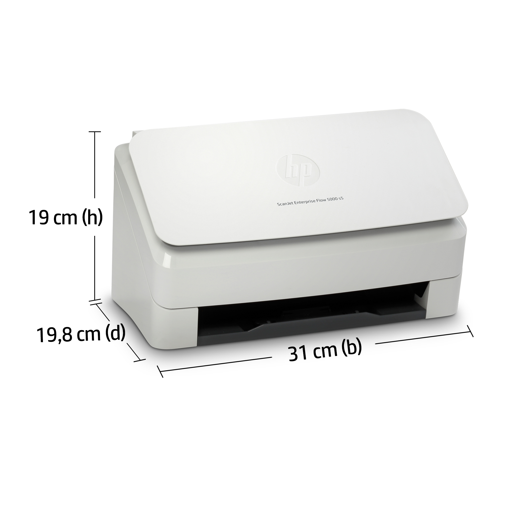 HP ScanJet Enterprise Flow 5000 s5 Scanner à defilement A4, jusqu’à 65ppm/130ipm, 600 x 600 DPI, 216 x 3100 mm, 600 x 600 DPI, Alimentation feuille à feuille de scanner, Blanc, CMOS CIS, 7500 pages