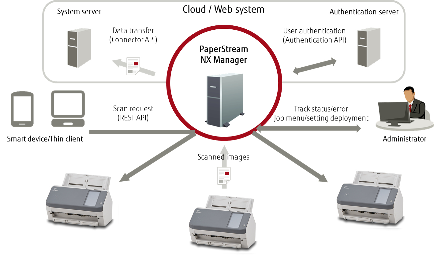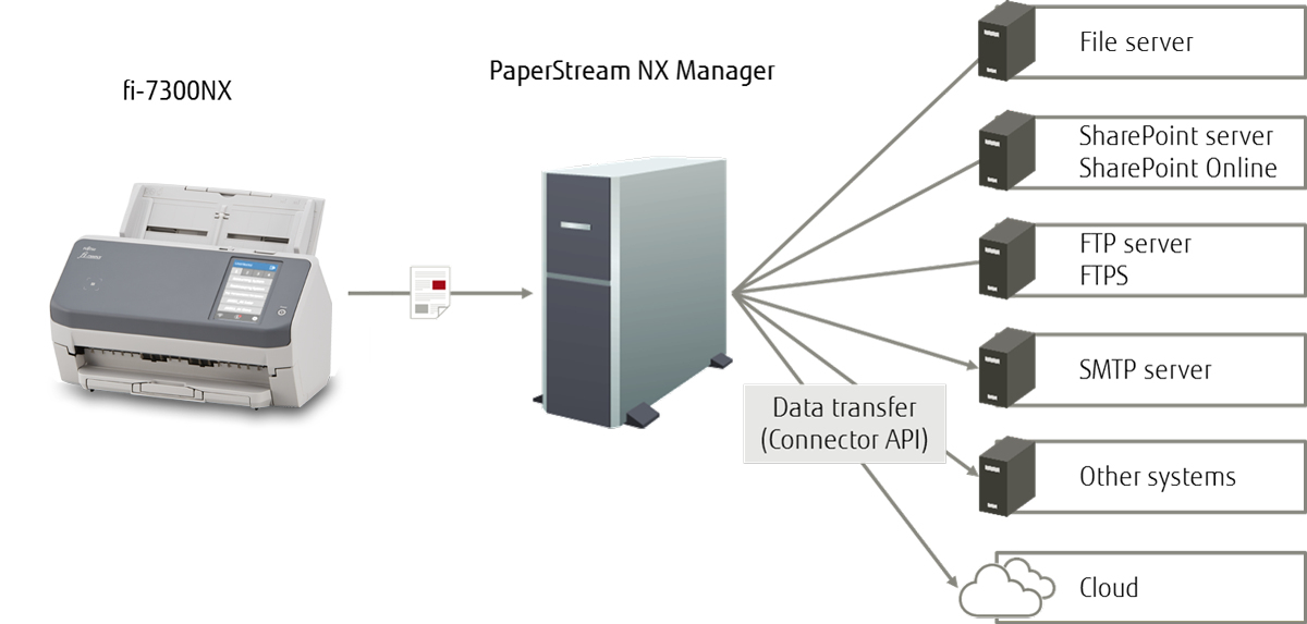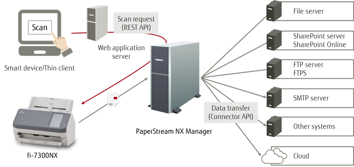 Grâce au logiciel PaperStream NX Manager, les utilisateurs peuvent lancer des numérisations depuis des applications mobiles ou Web ouvertes sur des appareils intelligents ou des terminaux client légers. L’intégration facile aux systèmes d’entreprise permet d’utiliser divers appareils pour les opérations de numérisation.