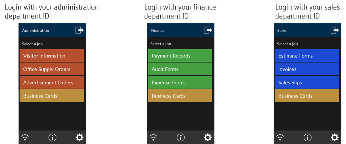 Les utilisateurs peuvent numériser et enregistrer des documents sans ordinateur local. Il leur suffit de se connecter au scanner à l’aide de l’authentification utilisateur et de sélectionner une tâche dans leurs menus personnalisés sur l’écran tactile du fi-7300NX. Les menus de tâches personnalisés garantissent la saisie de données décentralisée efficace et sécurisée pour chaque utilisateur. Le fi-7300NX prend en charge l’authentification NFC (type A et B), ainsi que l’authentification utilisateur via la saisie d’un nom d’utilisateur et d'un mot de passe sur l’écran tactile. Il est également possible d’affecter différents menus de tâches à chaque scanner et de contourner les éventuels processus d’authentification.