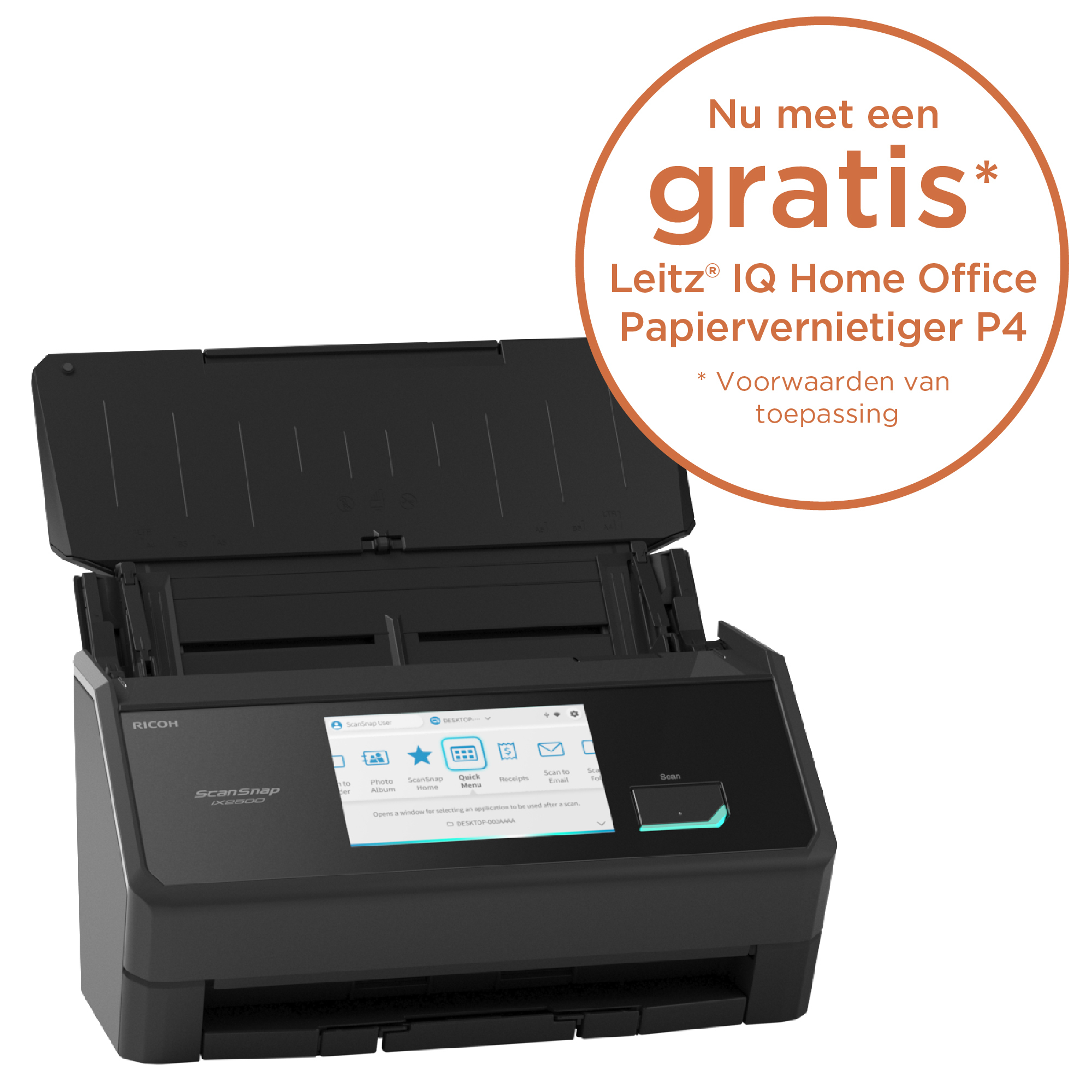 Ricoh ScanSnap IX2500. Surface maximal de numérisation: 297 x 432 mm, Résolution de numérisation optique: 600 x 600 DPI, Vitesse de numérisation ADF (n/b, A4): 45 ppm. Type de scanner: Scanner ADF, Couleur du produit: Noir, Taille de l'écran: 12,7 cm (5"). Type de capteur: Dual CIS, Source lumineuse: LED RGB, Formats des fichiers numérisés: JPEG, PDF. Capacité du chargeur automatique de documents: 100 feuilles. Taille de papier de série A ISO maximum: A4, Prise en charge des types de numérisation de support: Carte de visite, Papier photo, Papier ordinaire, Carte postale (JPN), ISO, Format Series A (A0...A9): A3, A4, A5, A6