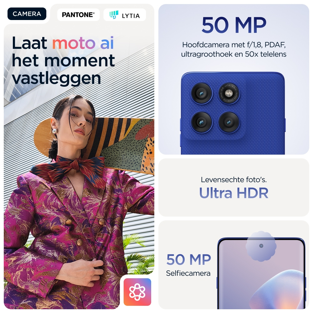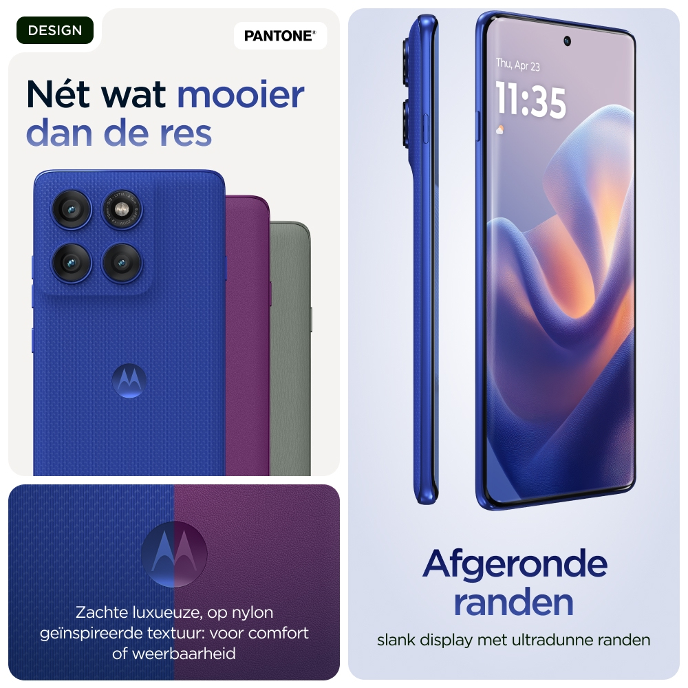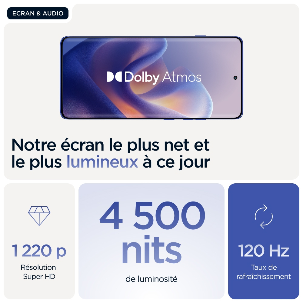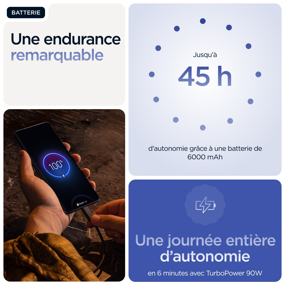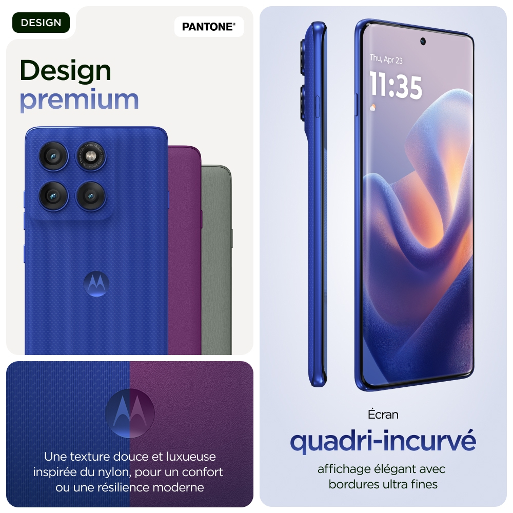 Vous attendez le meilleur en matière de qualité de fabrication. Découvrez le motorola edge 60 pro. Avec son design à bord infini incurvé sur les quatre côtés, ses finitions douces au toucher et ses coloris sélectionnés par Pantone®, il vous offre le summum en matière d’esthétique et de confort. Prenez des photos et des vidéos de niveau professionnel sans effort : il vous suffit de cadrer et d’appuyer sur le déclencheur. Profitez de moto ai, qui stimulera votre créativité et vous assistera dans toutes vos actions quotidiennes en arrière-plan. Vous pouvez compter sur une qualité de fabrication supérieure qui vous offre une sérénité totale grâce à sa résistance à l’immersion1 et à son design répondant à des normes militaires2. Poursuivez vos explorations sans interruption avec une autonomie de batterie supérieure à 45 heures4. Plongez dans vos divertissements sur son écran Super HD (1220p) de 6,7" accompagné du son Dolby Atmos®. De plus, vous pouvez tirer parti des puissantes performances optimisées par l’IA intégrées à l’appareil. En outre, vous profitez des expériences moto qui vous ouvrent les portes d’une liberté créative totale, d’interactions sans effort, et de la sérénité. Trouvez votre edge avec le motorola edge 60 pro.