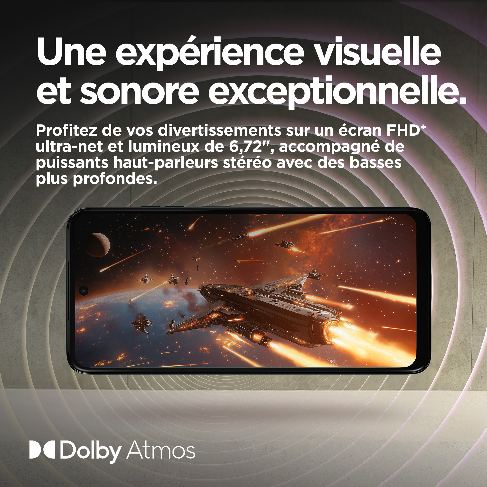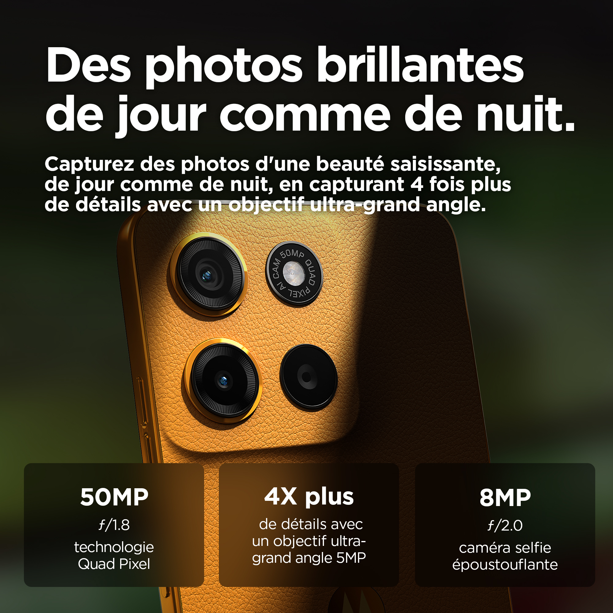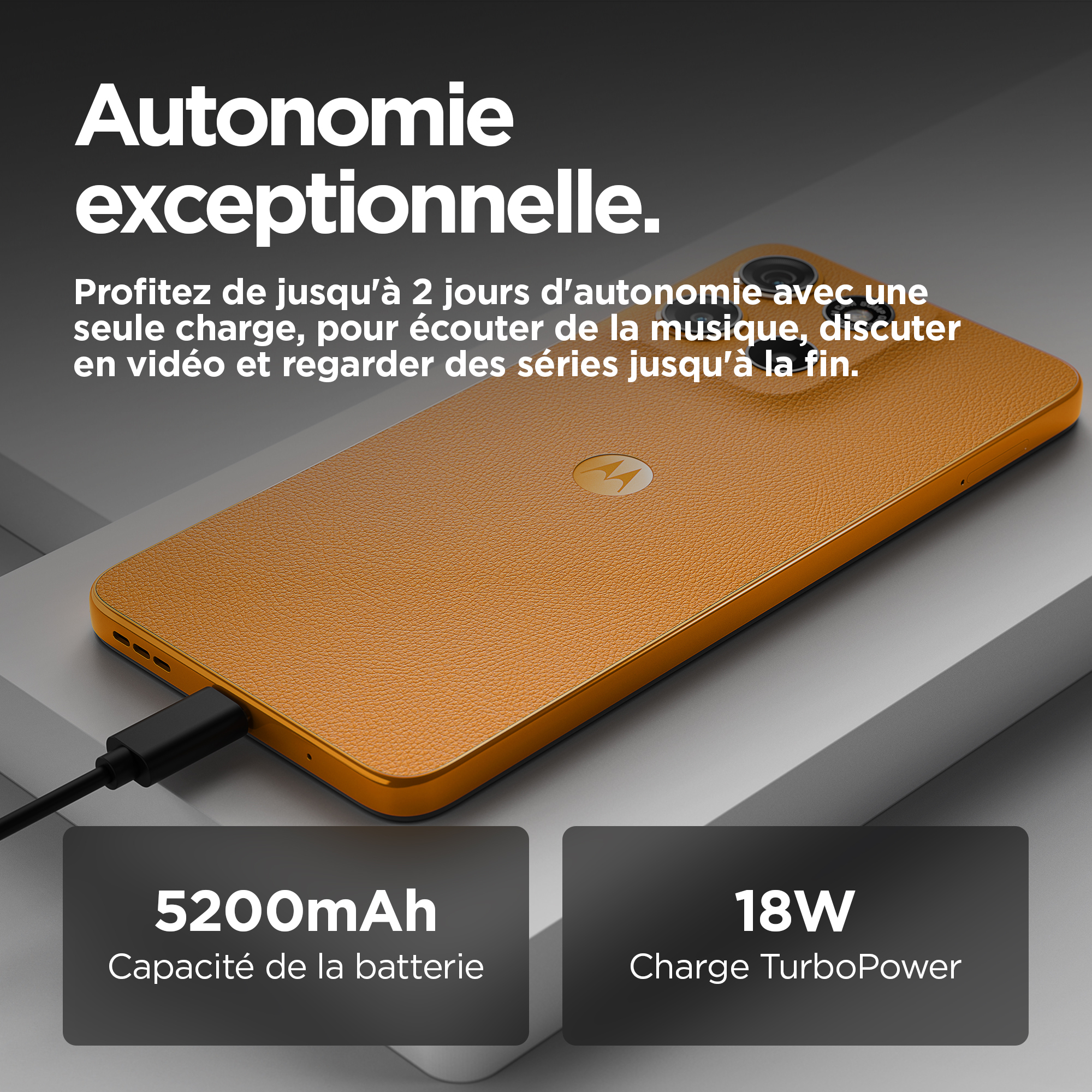 Le moto g15 vous offre le meilleur du divertissement cinématographique. Regardez vos émissions et films préférés sur un écran Full HD+ ultra net et lumineux de 6,72", même en plein soleil. Plongez dans un son multidirectionnel grâce aux puissants haut-parleurs stéréo avec Bass Boost et Dolby Atmos®. Capturez des photos magnifiquement détaillées avec l’appareil photo de 50 MP(1), éliminant les barres disgracieuses dues aux sources de lumière artificielle. Rechargez rapidement votre smartphone grâce au chargeur TurboPower™(2) et profitez d’une autonomie prolongée avec une batterie de 5 200 mAh. Le cuir vegan lui confère un style haut de gamme et son design résistant aux éclaboussures(3) et le verre Corning® Gorilla® Glass 3 renforcent sa protection. Bénéficiez de performances rapides et d’une grande capacité de stockage pour ne jamais être à court d’espace pour vos divertissements. Vivez chaque jour plus intensément avec le moto g15.