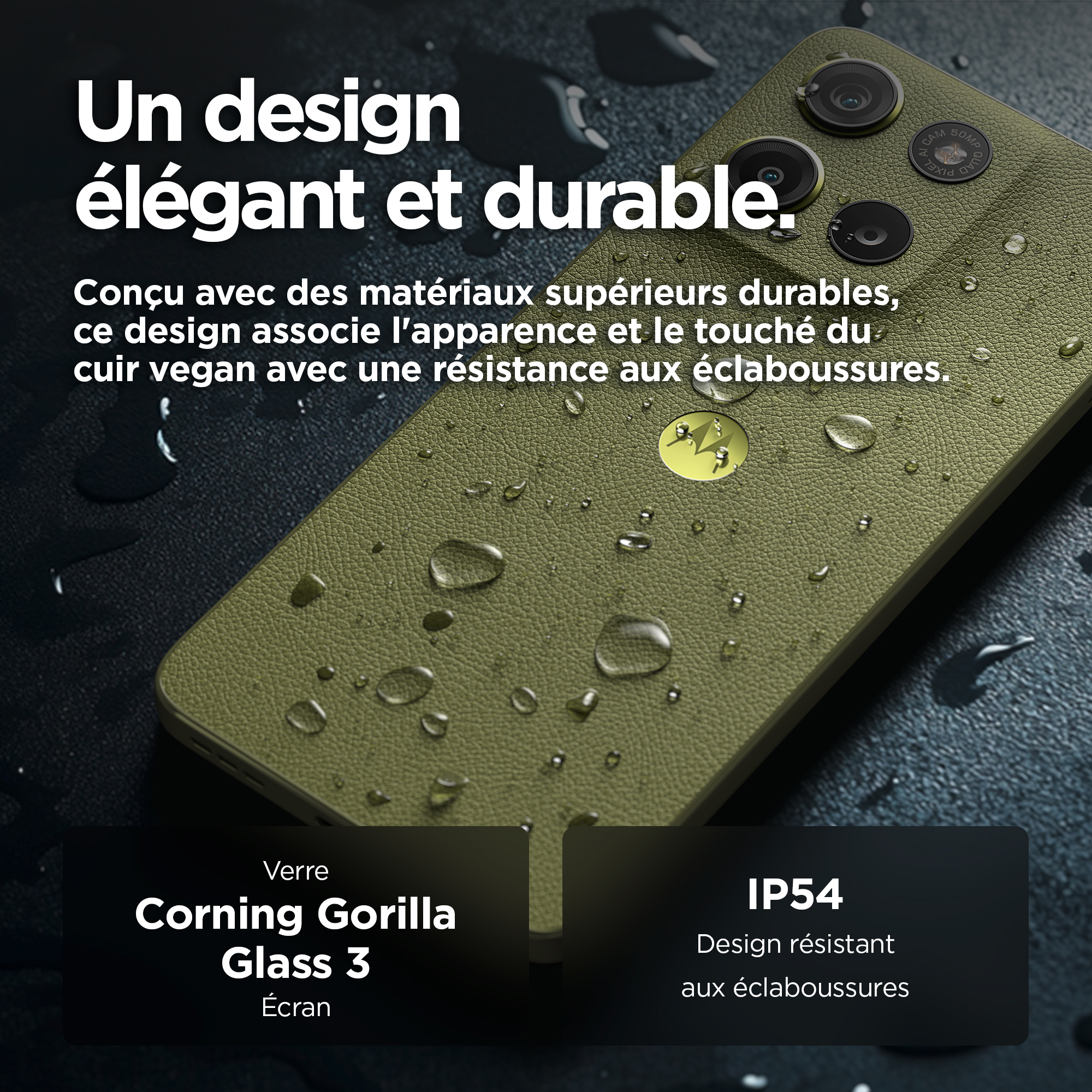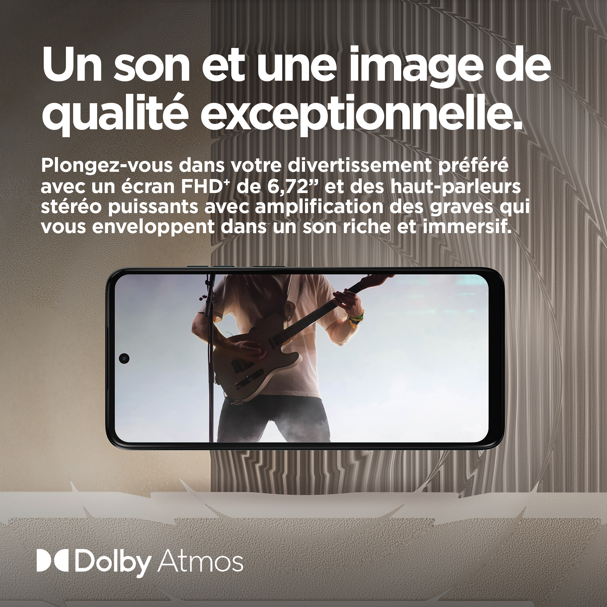 Le moto g15 power vous offre le meilleur du divertissement cinématographique. Regardez vos émissions et films préférés sur un écran Full HD+ de 6,72" ultra net et lumineux, même en plein soleil. Plongez dans un son multidirectionnel grâce aux puissants haut-parleurs stéréo avec Bass Boost et Dolby Atmos®. Capturez des photos magnifiquement détaillées avec l’appareil photo de 50 MP(1), éliminant les barres disgracieuses dues aux sources de lumière artificielle. Rechargez rapidement votre smartphone grâce au chargeur TurboPower™(2) et profitez d’une autonomie prolongée avec une batterie de 6 000 mAh. Le cuir vegan lui confère un style haut de gamme et son design résistant aux éclaboussures(3) et le verre Corning® Gorilla® Glass 3 renforcent sa protection. Bénéficiez de performances rapides et d’une grande capacité de stockage pour ne jamais être à court d’espace pour vos divertissements. Faites preuve d’audace avec le moto g15 power.