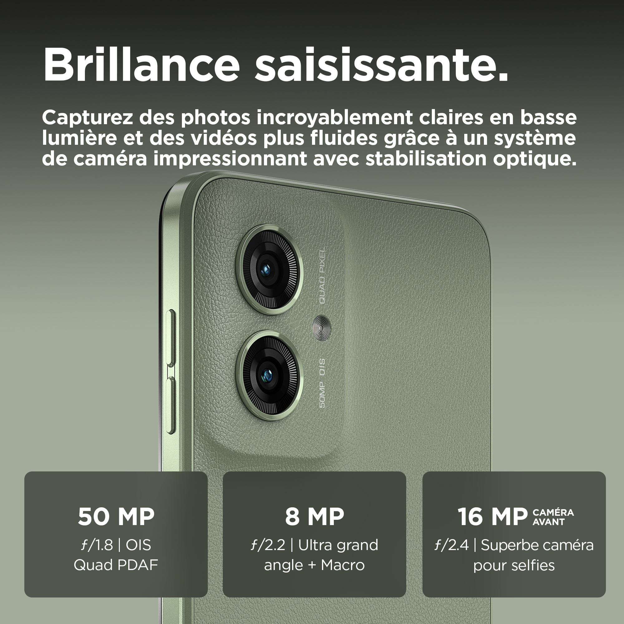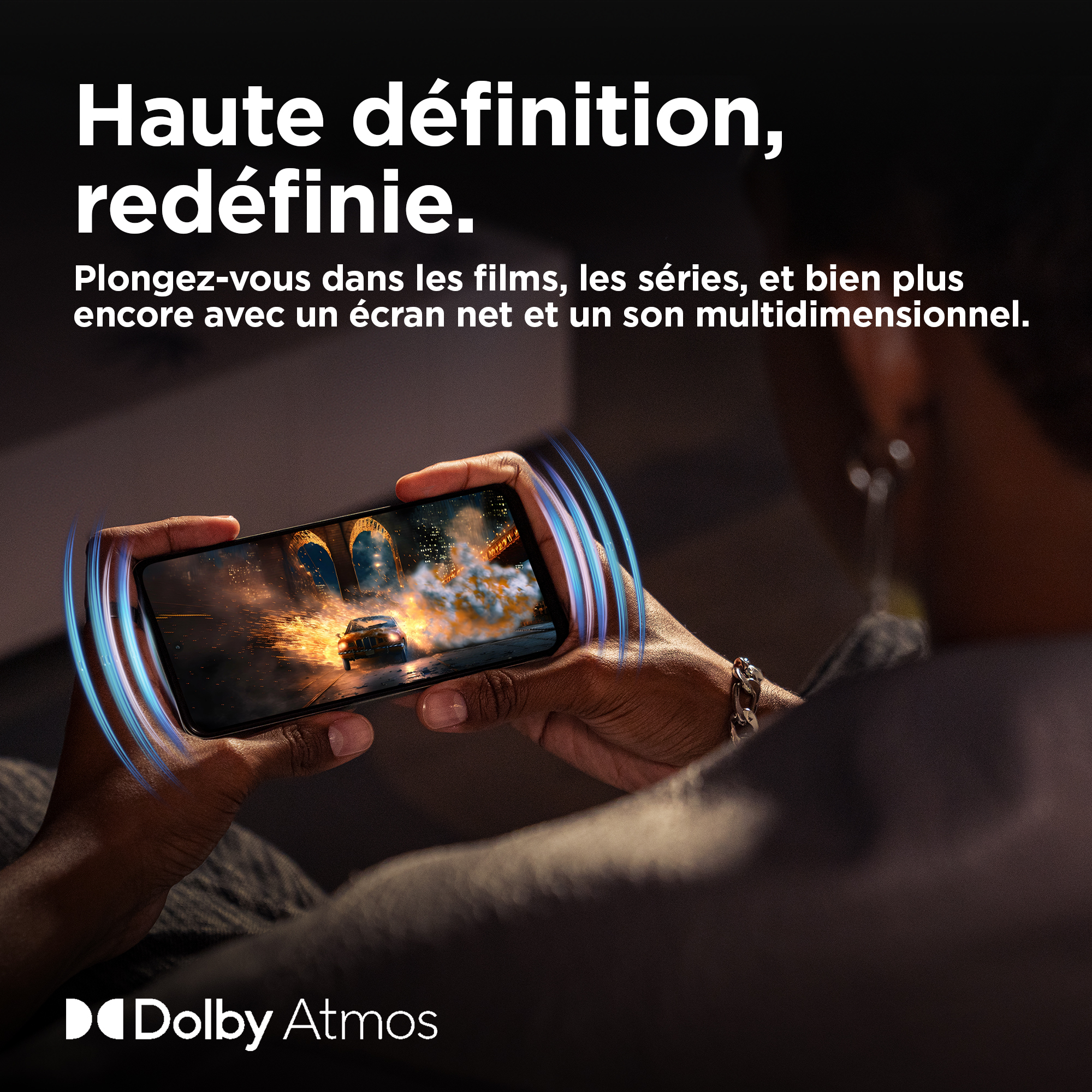 Découvrez le smartphone qui porte les divertissements dans son ADN. Le nouveau moto g55 5G. Donnez vie à vos émissions, films et jeux sur son écran immersif FHD+ de 6,49" et 120 Hz(1). Profitez d’un son multidirectionnel grâce aux haut-parleurs stéréo et à Dolby Atmos®(2). Prenez des photos d’une netteté spectaculaire et améliorez la fluidité de vos vidéos avec l’appareil photo de 50 MP équipé de la stabilisation d’image optique (OIS)(3). Et démarquez-vous avec son superbe design qui comprend des options en cuir vegan doux au toucher. Avec le moto g55 5G, vous pouvez enchaîner les épisodes de vos séries grâce à sa batterie longue durée et à une charge rapide. Conservez un plus grand nombre de vos contenus préférés grâce au vaste espace de stockage intégré. Son puissant processeur octa-core vous permet de vous divertir à la vitesse de la 5G. Le moto g55 5G révolutionne vos divertissements.