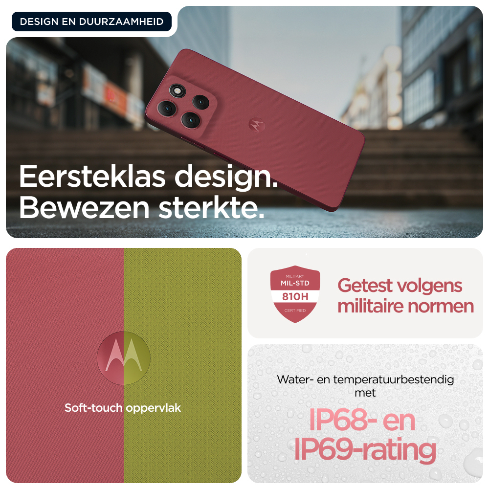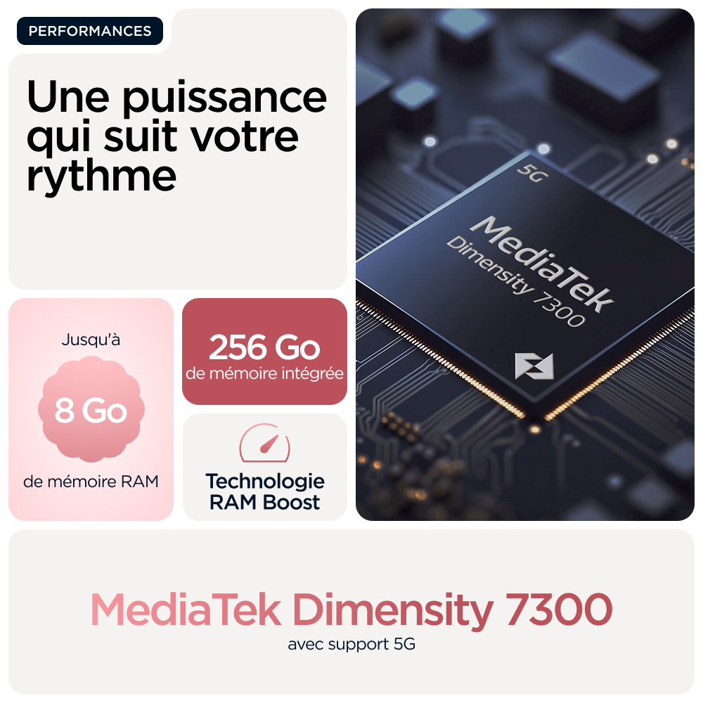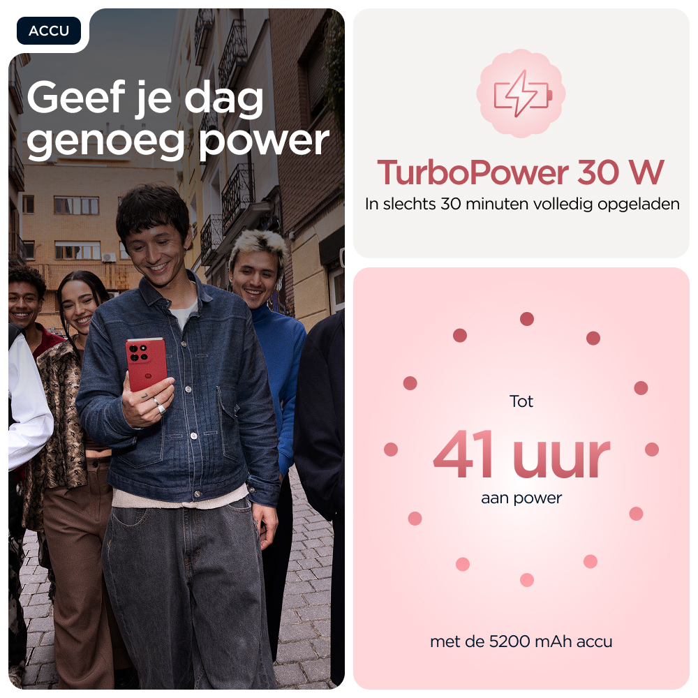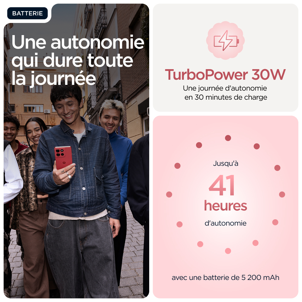 Découvrez le moto g86 5G, destiné à celles et ceux qui cherchent à repousser les limites. Soigneusement conçu à partir de matériaux de qualité, il se distingue par son design audacieux et une protection renforcée contre les éclaboussures et les chutes(6,7). Visualisez tous les contenus sur un écran Super HD (1220p) ultra lumineux de 6,67" accompagné du son Dolby Atmos®. Prenez des photos éblouissantes avec l’appareil photo Sony LYTIA™ 600 de 50 MP optimisé par moto ai(12) et capturez des images dignes d’un pro en toute facilité. Bénéficiez de plus de 41 heures d’autonomie en seulement quelques minutes grâce à la charge TurboPower™(1,13). Découvrez la puissance d’un processeur avancé, associée à 8 Go de RAM, extensible à 24 Go avec l’extension de RAM, et jusqu’à 256 Go d’espace de stockage(3,9). Laissez libre cours à votre créativité, interagissez sans effort et profitez d’une totale tranquillité d’esprit avec des expériences Moto exclusives. Vivez pleinement vos aventures avec le moto g86 5G.
