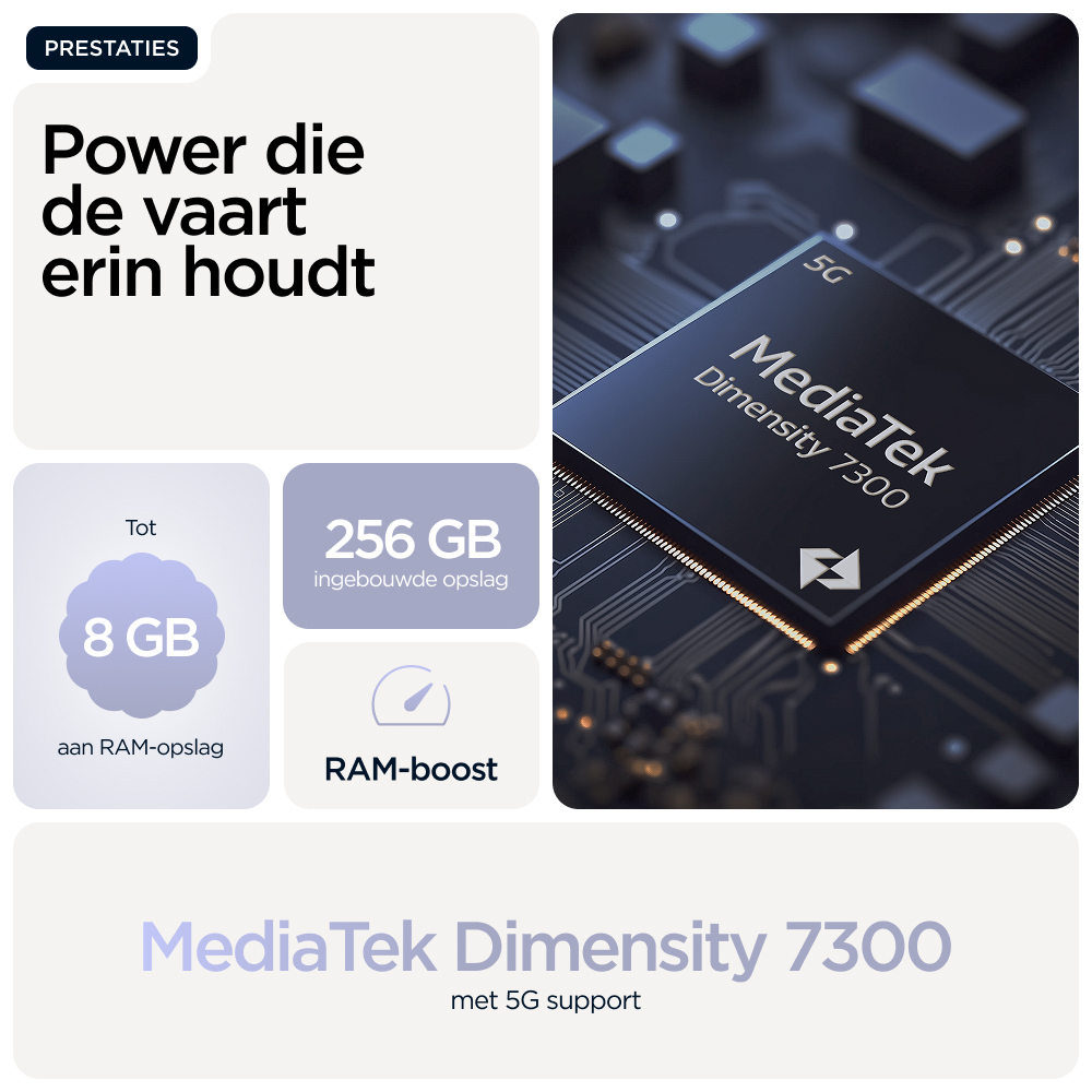 6.67", AMOLED, HDR10+, 2712 x 1220px, 446ppi, MediaTek Dimensity 7300, 8/256GB, 50MP + 8MP, 32MP, USB Type-C, 5G, Bluetooth 5.4, Wi-Fi 6, NFC, Android 15