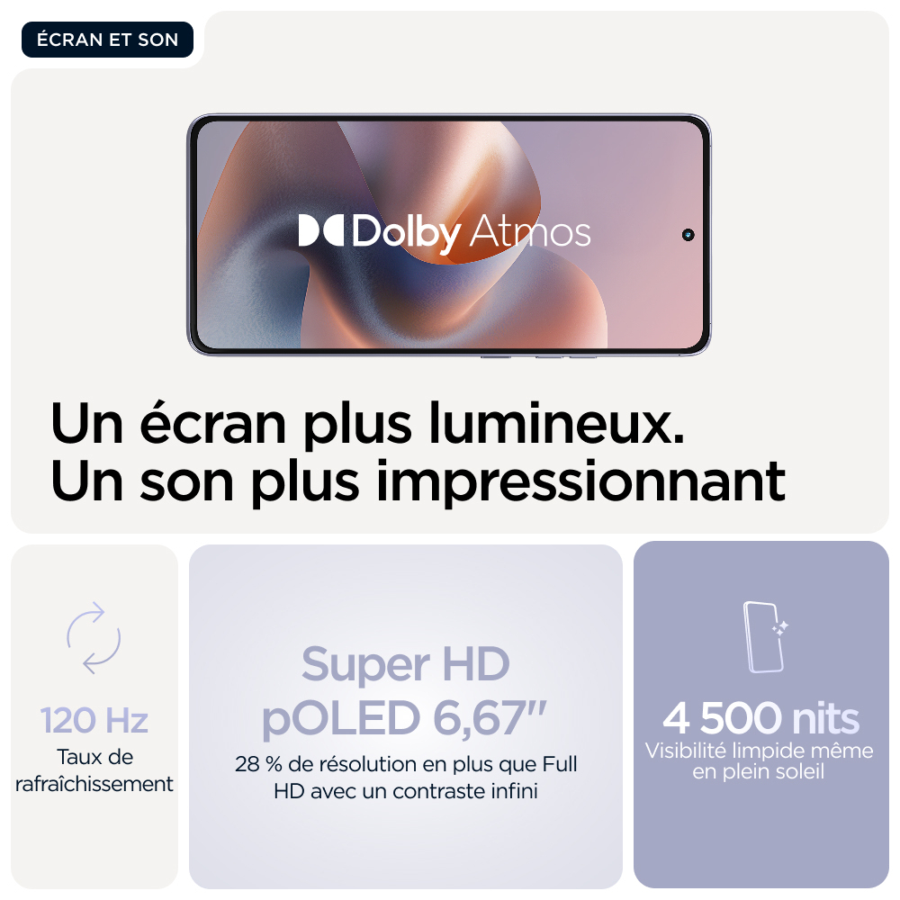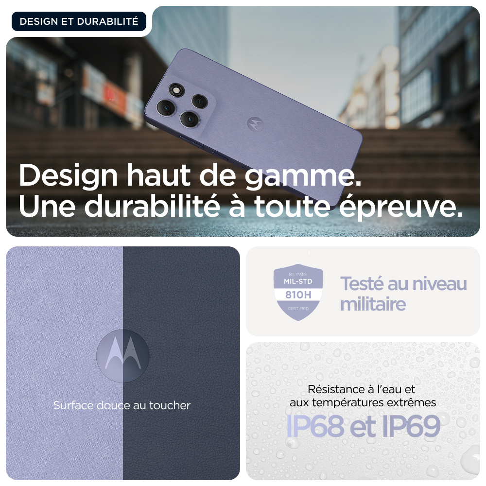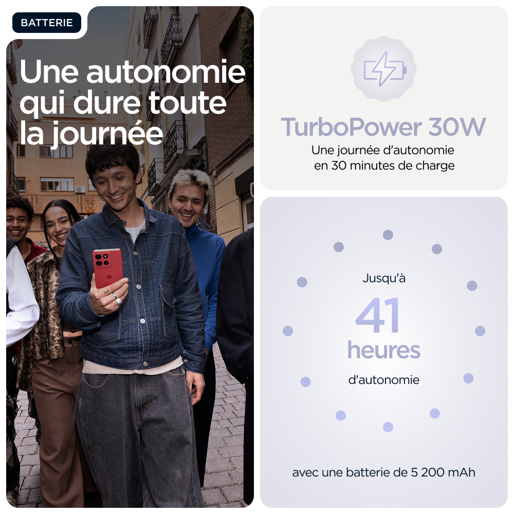Découvrez le moto g86 5G, destiné à celles et ceux qui cherchent à repousser les limites. Soigneusement conçu à partir de matériaux de qualité, il se distingue par son design audacieux et une protection renforcée contre les éclaboussures et les chutes(6,7). Visualisez tous les contenus sur un écran Super HD (1220p) ultra lumineux de 6,67" accompagné du son Dolby Atmos®. Prenez des photos éblouissantes avec l’appareil photo Sony LYTIA™ 600 de 50 MP optimisé par moto ai(12) et capturez des images dignes d’un pro en toute facilité. Bénéficiez de plus de 41 heures d’autonomie en seulement quelques minutes grâce à la charge TurboPower™(1,13). Découvrez la puissance d’un processeur avancé, associée à 8 Go de RAM, extensible à 24 Go avec l’extension de RAM, et jusqu’à 256 Go d’espace de stockage(3,9). Laissez libre cours à votre créativité, interagissez sans effort et profitez d’une totale tranquillité d’esprit avec des expériences Moto exclusives. Vivez pleinement vos aventures avec le moto g86 5G.