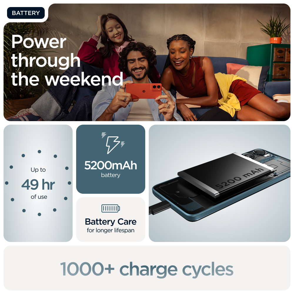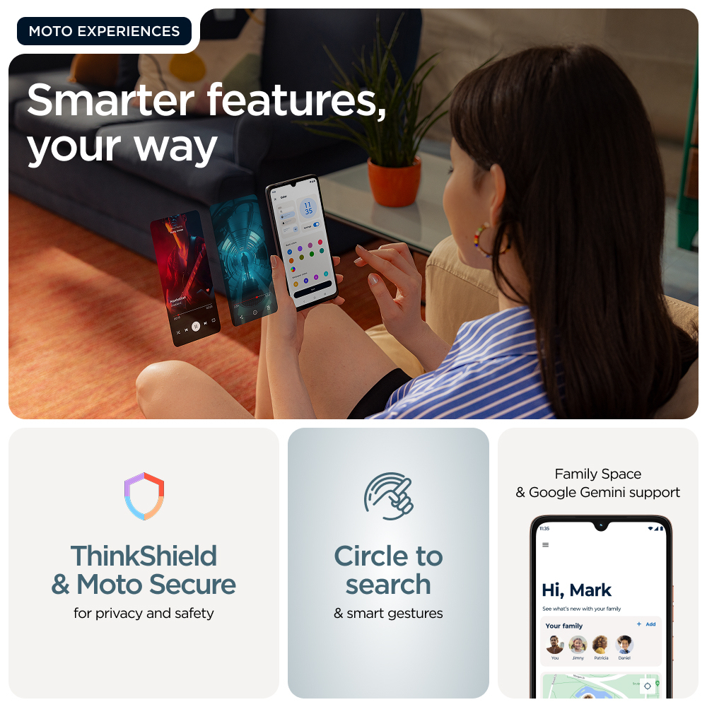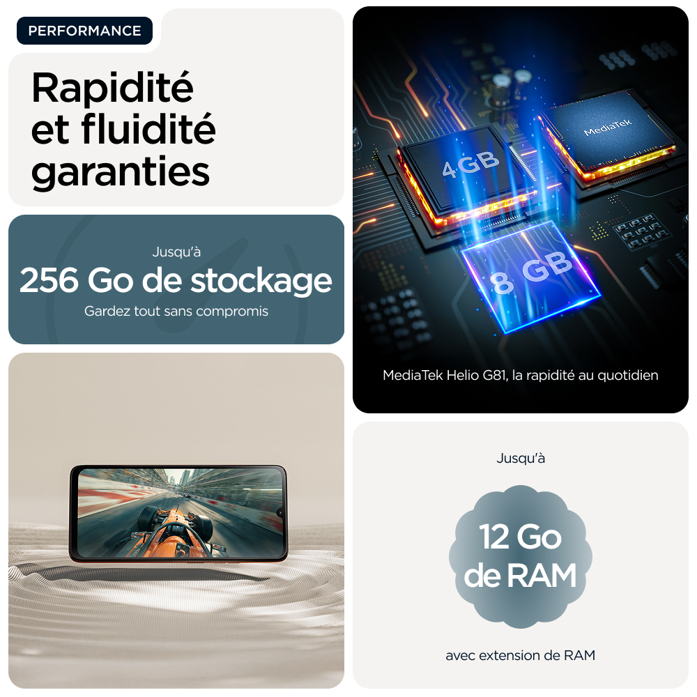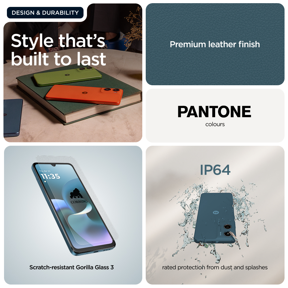 Voici le moto g06, un téléphone conçu pour dépasser vos attentes. Donnez vie à vos émissions et films préférés sur un imposant écran lumineux de 6,88", le plus grand écran jamais conçu pour moto g, avec haut-parleurs stéréo et son Dolby Atmos®. Prenez de superbes photos peu importe la luminosité avec un système d'appareil photo de 50 MP optimisé par l'IA.(1) Effectuez efficacement plusieurs tâches simultanément avec un maximum de 12 Go de RAM avec l'extension de RAM.(2,5,6,10) Gardez l'esprit tranquille grâce aux caractéristiques avancées de durabilité et à un design haut de gamme, notamment une protection contre les éclaboussures certifiée IP64(3), le verre Corning® Gorilla® Glass 3 et une finition en cuir végétalien. Deux jours d'utilisation avec une seule charge.(4) Et profitez des expériences Moto exclusives qui rendent votre téléphone plus sécurisé, personnel et ludique. Et avec la fonction Entourer pour rechercher, vous pouvez rechercher instantanément tout ce que vous voyez sur votre téléphone. Profitez au maximum du moto g06.