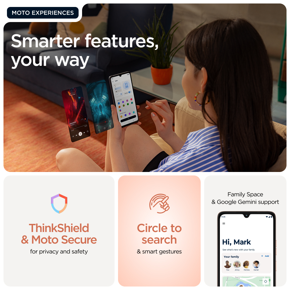 6.88", LCD, 120Hz, 1640 x 720px, MediaTek Helio G81, 4/256GB, 50MP + 8MP, 4G, Bluetooth 6.0, 802.11 a/b/g/n/ac, 3.5mm, USB Type-C, Android 15