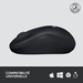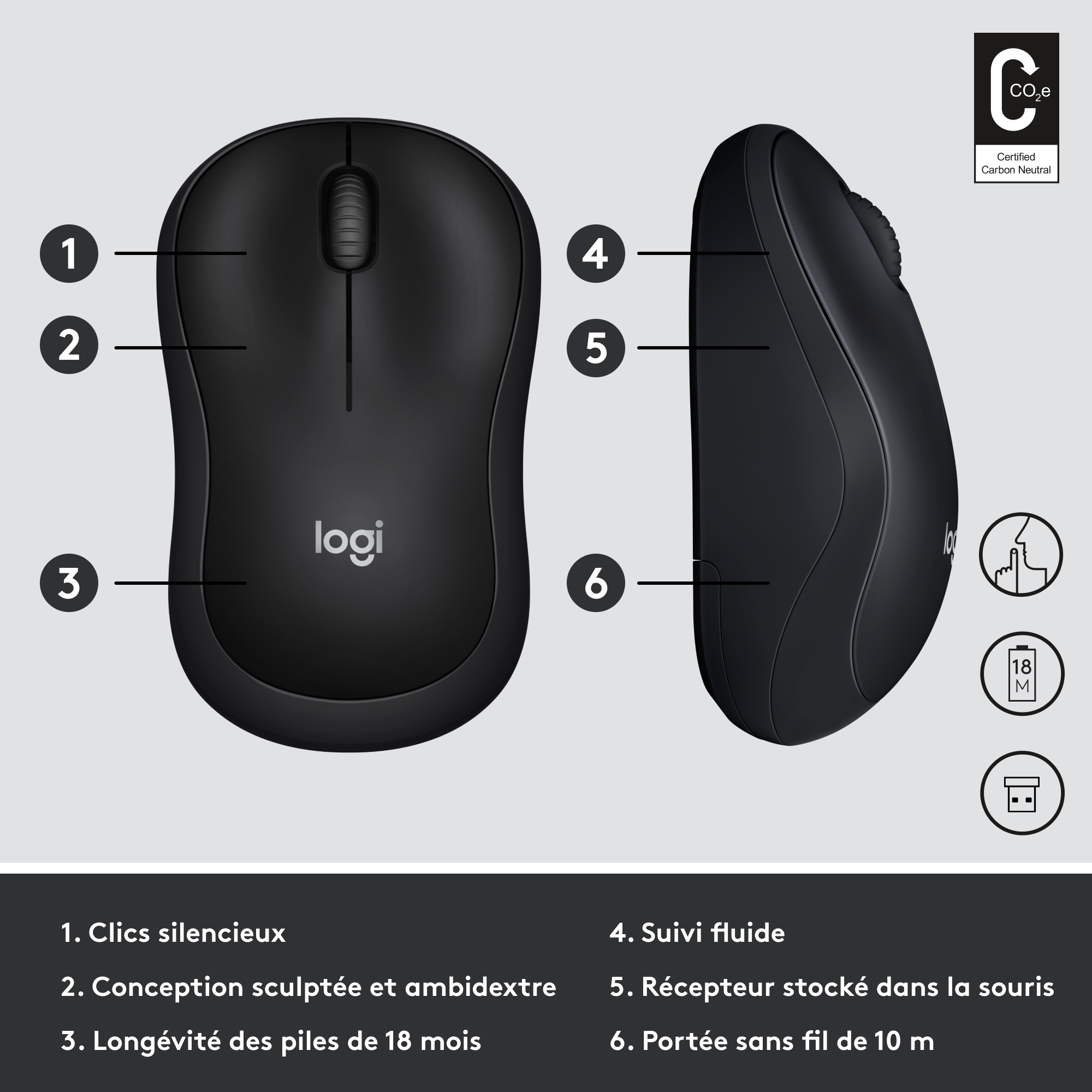 Avec la M220 SILENT, profitez d'une expérience silencieuse grâce à la réduction des bruits de 90 % sans perdre le confort de clic d'une souris classique. Elle bénéficie aussi d'une autonomie de 18 mois, d'une mise en veille automatique et d'une portée sans fil de 10 mètres avec cryptage sécurisé 128 bits entre elle et le récepteur. De plus, son petit format facilite son transport dans un sac en cas de déplacements. Branchez simplement le récepteur USB compact, la souris fonctionne avec Windows®, Mac, ChromeOS™ ou Linux®. La souris intègre également la technologie avancée de suivi optique Logitech® pour des mouvements fluides et précis sur tout type de surface.
