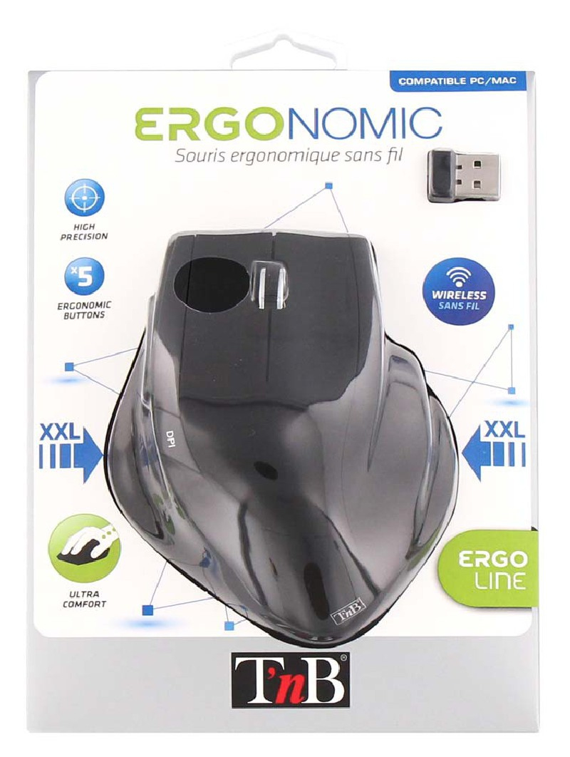 Souris sans fil Ergonomique Design optimisé pour une utilisation confortable Taille et forme épousant parfaitement les contours de la main Souris large pour poser tous les doigts et évite les frottements 5 boutons (dont Suivant/Précédant/switch dpi) + molette cliquable