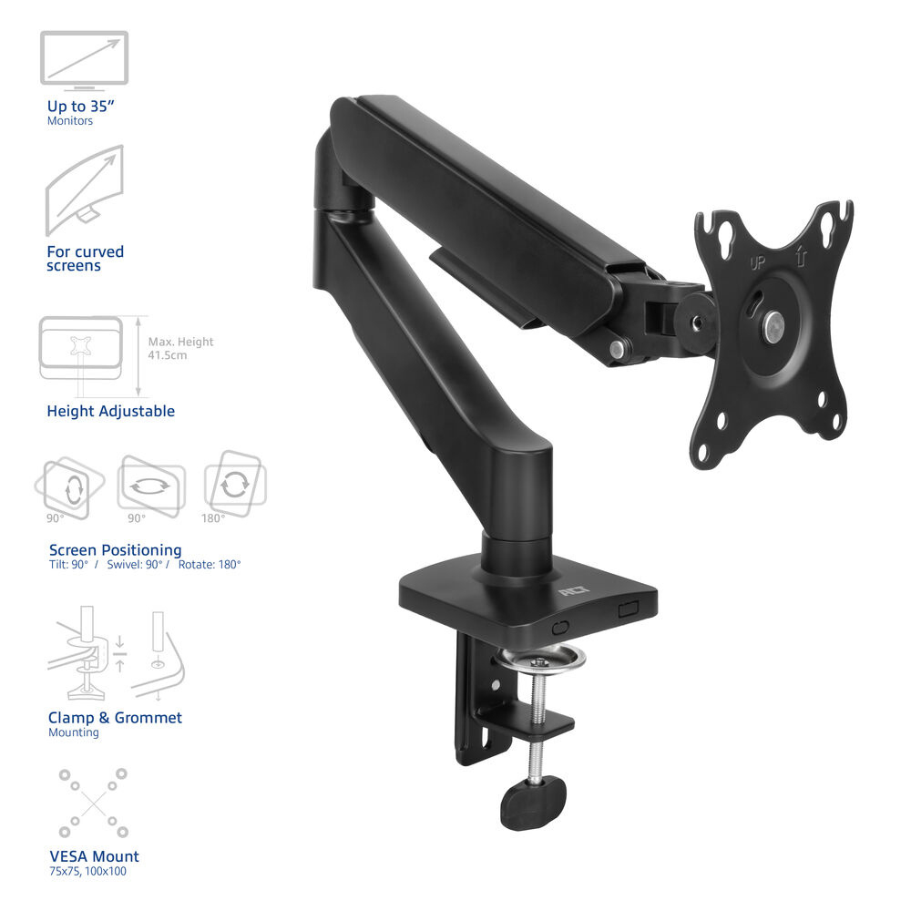 ACT Bras pour écran 35 pouces, vérin à gaz, 1 écran, Essentials, Collier de serrage/ passe-fil, 9 kg, 43,2 cm (17"), 88,9 cm (35"), 100 x 100 mm, Noir