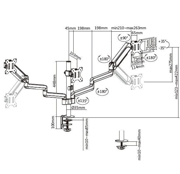 Le mécanisme à ressort à gaz permet de régler la hauteur en douceur et sans effort, améliorant ainsi le confort ergonomique en permettant aux utilisateurs de modifier facilement la position des moniteurs en fonction de leurs angles de vue préférés. Ce support riche en fonctionnalités offre des réglages d'inclinaison, de pivotement et de rotation, permettant aux utilisateurs de créer une configuration personnalisée et confortable pour la productivité, les jeux ou les divertissements. La gestion intégrée des câbles permet de garder les fils bien rangés et d'organiser l'espace de travail.
