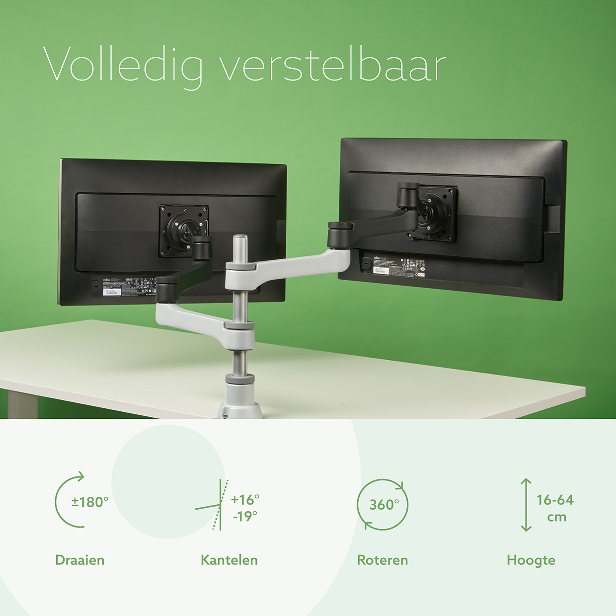Avec le bras double moniteur R-Go, vous pouvez facilement et rapidement positionner vos moniteurs à hauteur des yeux. En outre, vous pouvez incliner et faire pivoter les écrans selon vos besoins. Les bras de moniteur Caparo disposent même d’un vérin à gaz intégré, ce qui vous permet de régler facilement les écrans en hauteur et en profondeur d’une seule main. Idéal pour les postes de travail flexibles ! Grâce à leur caractère modulaire, vous pouvez facilement étendre les bras de moniteur selon vos besoins avec un porte-documents, un porte-ordinateur, une Smartbar ou un bras supplémentaire. Les bras porte-moniteur peuvent être fixés au-dessus du plan de travail. Vous pouvez ainsi travailler en position verticale, même pendant l’installation ! De plus, vous n’avez besoin d’aucun outil pour l’installation. Les bras de moniteur R-Go sont conçus pour être neutres en CO2. Les émissions de CO2 produites lors de la fabrication d’un bras de moniteur sont compensées par la plantation d’arbres. Les bras de surveillance R-Go sont conçus aux Pays-Bas et disposent de fonctions SMART brevetées, telles qu’un arrêt de rotation pour chaque pièce mobile. Ce SMART STOP empêche les bras de moniteur d’entrer en collision avec un mur (acoustique).