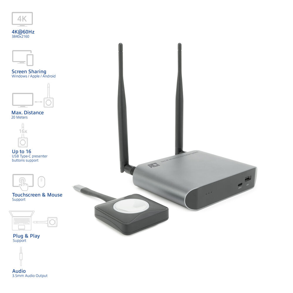 ACT Système de présentation sans fil Aero 4K, Bureau, Noir, Gris, 3840 x 2160, 2160p, USB Type-C, USB