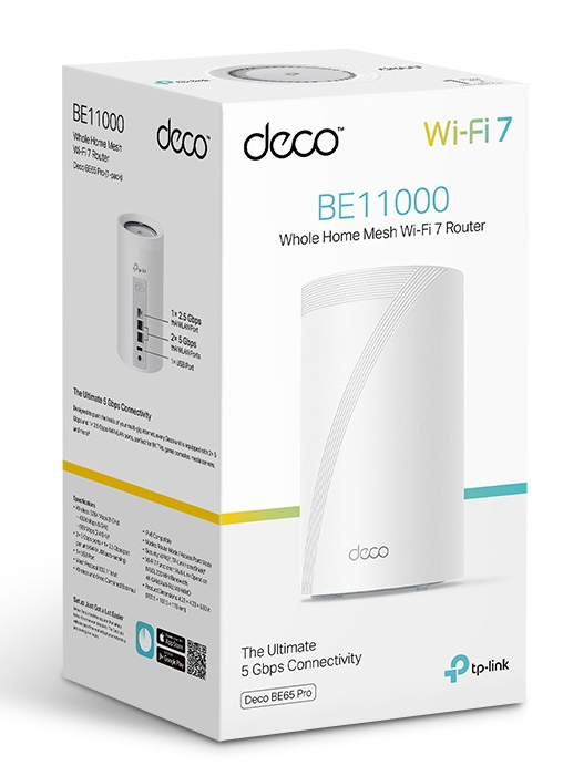 TP-Link Deco BE65 Pro (2-pack). Couleur du produit: Blanc, Type d'antenne: Interne, Type de produit: Système maillé. Bande Wi-Fi: Tri-bande (2,4 GHz / 5 GHz / 6 GHz), Norme Wi-Fi: Wi-Fi 7 (802.11be), Débit de transfert des données WLAN (max): 9300 Mbit/s. Assistant virtuel: Amazon Alexa & Google Assistant, Pare-feu de sécurité: SPI, Fonctions contrôle parental: Heure du coucher, Profils personnalisés, Family online time ranking, Temps en famille, Off time,.... LAN Ethernet : taux de transfert des données: 100,1000,5000 Mbit/s. Consommation électrique typique: 29 W, Tension d'entrée AC: 100 - 240 V, Courant d'entrée de l'adaptateur CA: 1 A