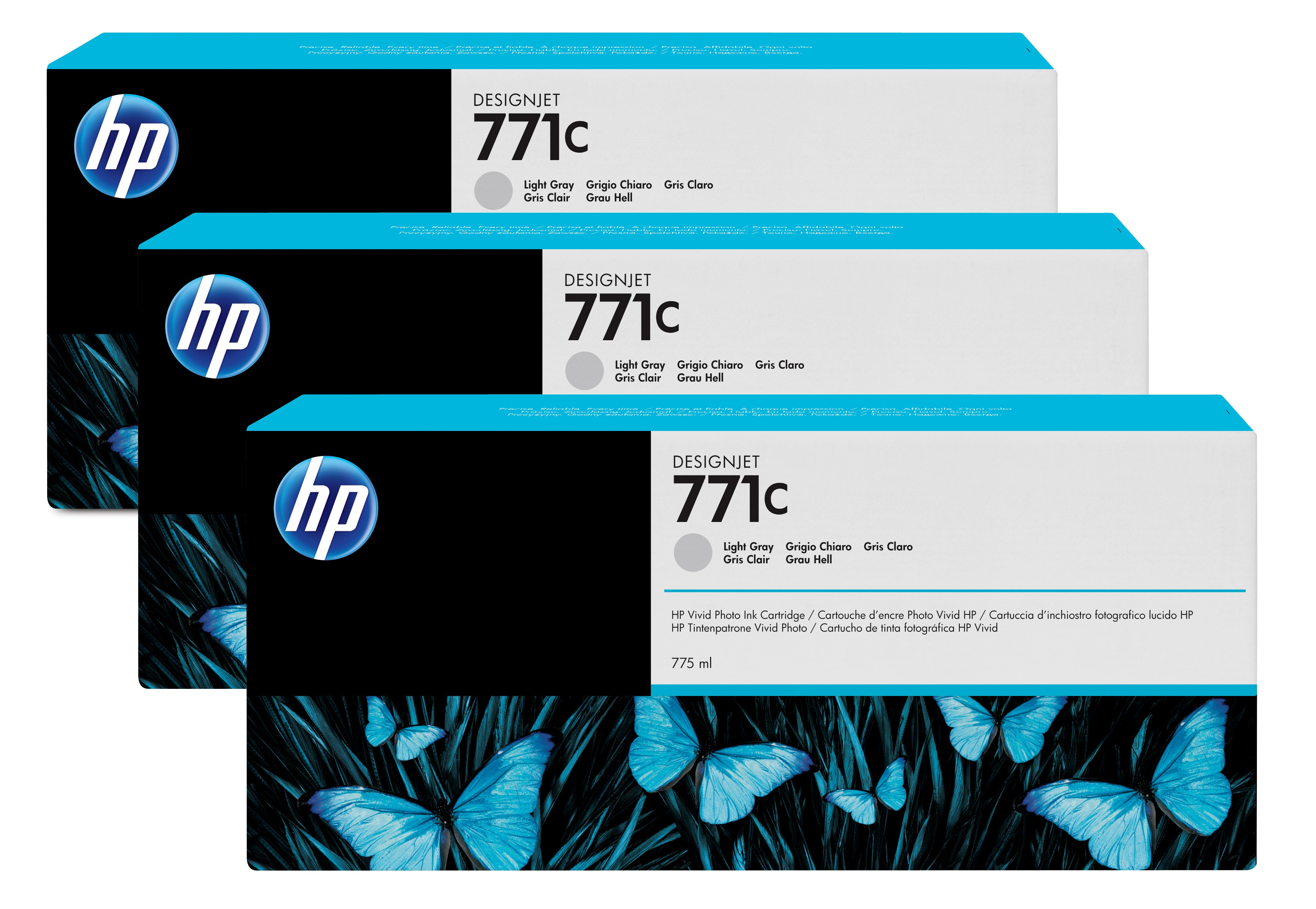 HP 771C pack de 3 cartouches d'encre DesignJet gris clair, 775 ml, Imprimante photo HP DesignJet série Z6200, imprimante photo de production HP DesignJet Z6610,..., A jet d'encre thermique, Gris, B6Y38A, Moyenne entreprise, Singapour