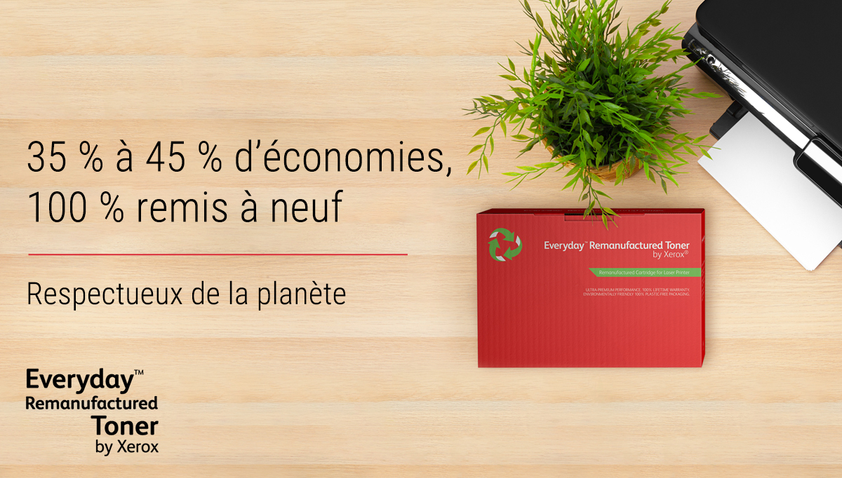 Rien de mieux que d’agir dans le respect de l’environnement pour protéger notre planète, votre entreprise et vos collaborateurs. Le toner remis à neuf Everday de Xerox a une empreinte carbone plus faible que n’importe quelle autre cartouche de toner jetable, parce que vous ne devriez pas avoir à choisir entre faire votre part et réduire votre impact environnemental et vos coûts de toner. Grâce à la compatibilité avec les marques d’imprimantes les plus populaires, vous pouvez profiter de la gestion et de la qualité incomparables de Xerox, quelle que soit votre imprimante.