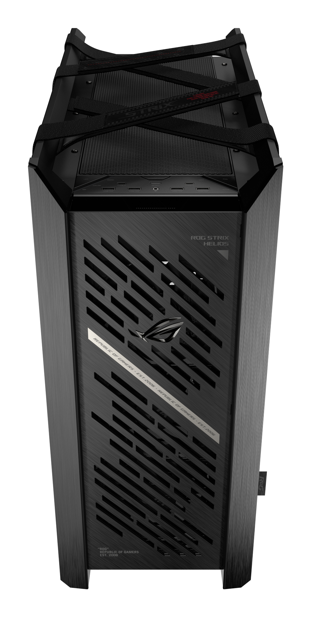 ASUS ROG Strix Helios II GX601S. Format: Midi Tower, Type: PC, Couleur du produit: Noir. Ventilateurs installés avant: 3x 140 mm, Prise en charge des diamètres des ventilateurs avants: 120,140 mm, Ventilateurs arrières installés: 1x 140 mm. Tailles de disques durs supportées: 2.5,3.5". Largeur: 250 mm, Profondeur: 565 mm, Hauteur: 591 mm. Largeur du colis: 705 mm, Profondeur du colis: 390 mm, Hauteur du colis: 740 mm