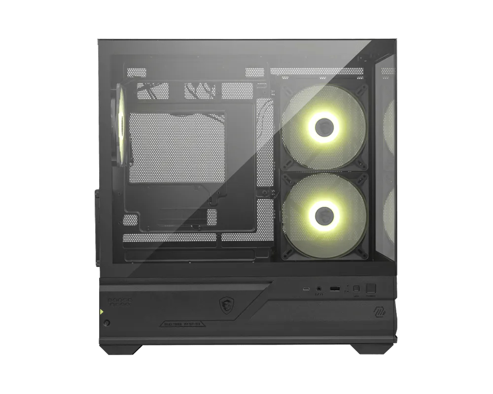 MSI MAG PANO M110R. Format: Mini Tower, Type: PC, Couleur du produit: Noir. Emplacement d'alimentation: Bas. Ventilateurs latéraux installés: 3x 120 mm, Pris en charge des diamètres des ventilateurs latérals: 120 mm, Ventilateurs arrières installés: 1x 120 mm. Tailles de disques durs supportées: 2.5,3.5". Largeur: 225 mm, Profondeur: 434 mm, Hauteur: 444 mm