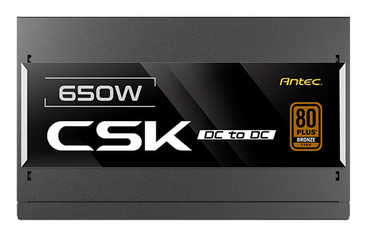 Antec CSK650DC EC. Puissance totale: 650 W, Tension d'entrée AC: 100 - 240 V, Fréquence d'entrée AC: 50/60 Hz. Connecteur de la carte mère: 20+4 pin ATX, Type de câblage: Non-modulaire. Utilité: PC, Facteur de forme de l'unité d'alimentation: ATX, Certification 80 PLUS: 80 PLUS Bronze. Couleur du produit: Noir, Diamètre du ventilateur: 12 cm. Certificats de conformité: BIS, BSMI, CB, CE, Federal Communications Commission (FCC), ICES, KC, RCM, UKCA, cTUVus