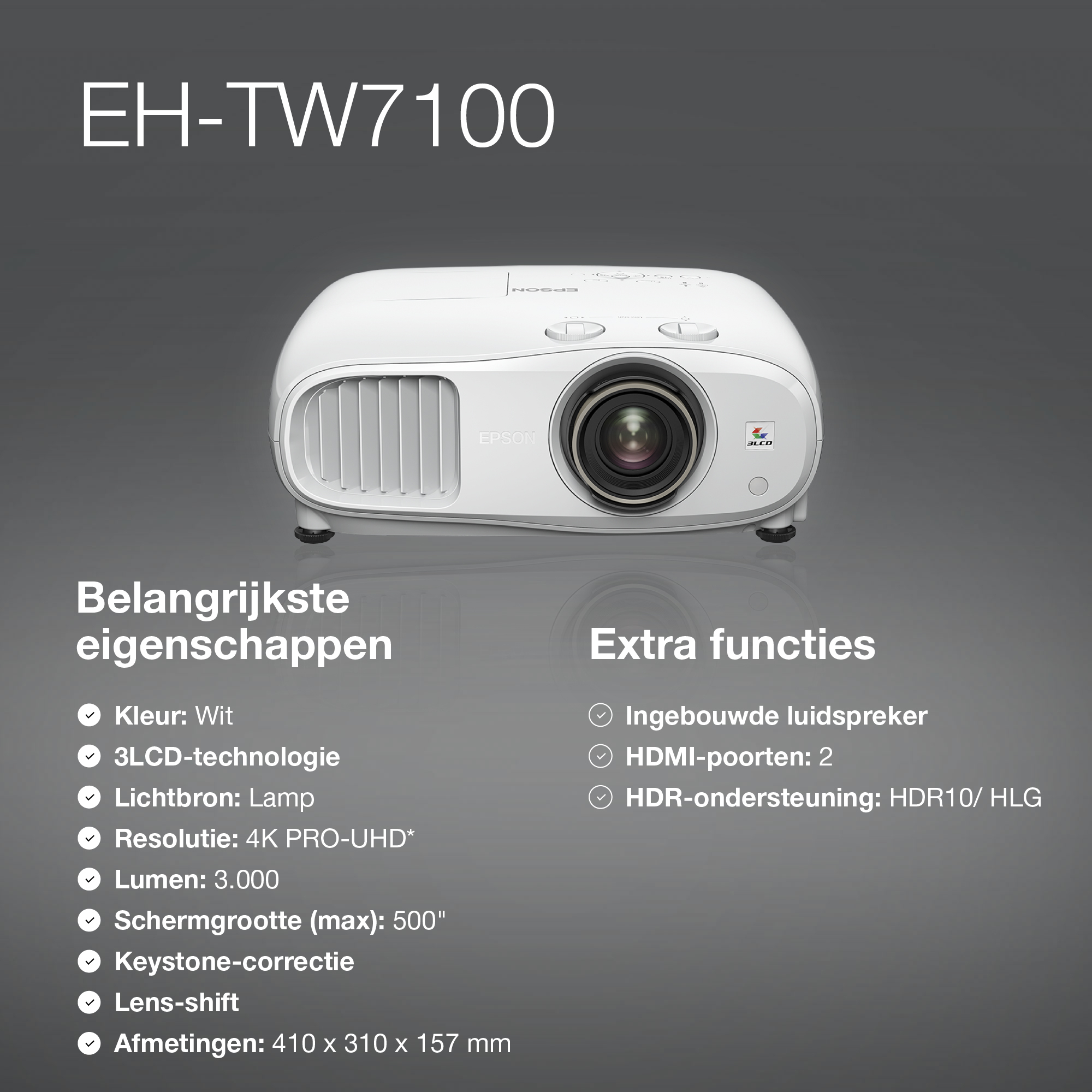 Epson EH-TW7100, 3000 ANSI lumens, 3LCD, UHD 4K (3840x2160), 100000:1, 16:9, 1016 - 12700 mm (40 - 500")