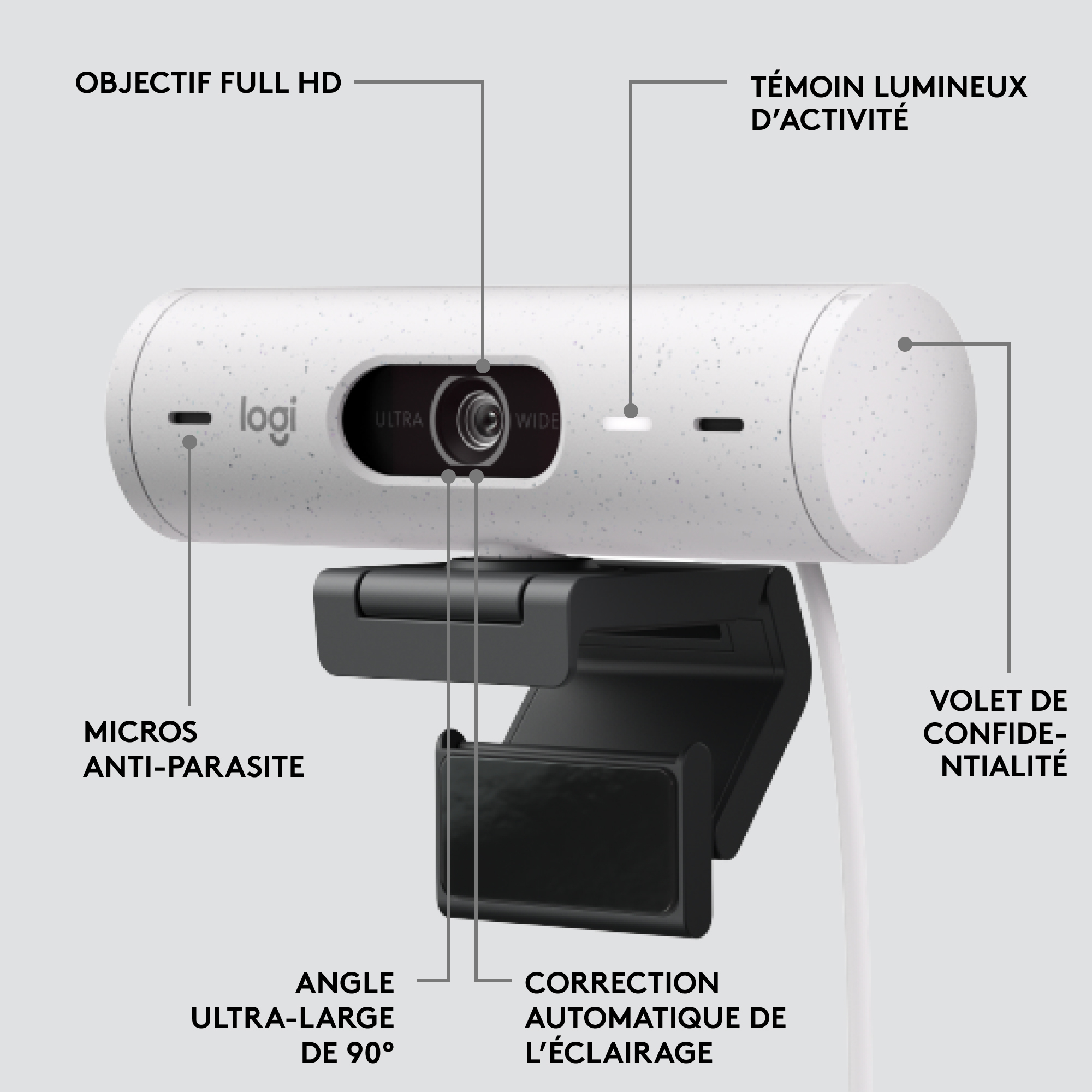 Logitech Brio 500. Mégapixel: 4 MP, Résolution vidéo maximale: 1920 x 1080 pixels, Type HD de la caméra: Full HD. Interface: USB, Couleur du produit: Blanc, Type de montage: Clip. Prise en charge du système d'exploitation Mac: Oui, MacOS, Prise en charge d'autres systèmes d'exploitation: ChromeOS. Certificats de durabilité: Forest Stewardship Council (FSC). Largeur: 110 mm, Profondeur: 31,5 mm, Hauteur: 31,5 mm