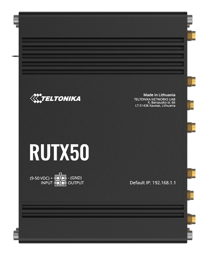 Teltonika RUTX50. Type de connexion WAN: RJ-45. Bande Wi-Fi: Bi-bande (2,4 GHz / 5 GHz), Norme Wi-Fi: Wi-Fi 5 (802.11ac), Débit de transfert des données WLAN (max): 867 Mbit/s. Type d'interface LAN Ethernet: Gigabit Ethernet, LAN Ethernet : taux de transfert des données: 10,100,1000 Mbit/s. Génération de réseau mobile: 5G. Nombre de port ethernet LAN (RJ-45): -5