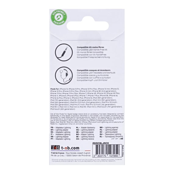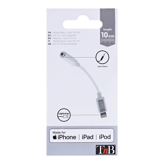 T'nB ADACBLJACK. Aansluiting 1: Lightning, Aansluiting 2: 3.5mm, Aansluiting 1 type: Mannelijk. Gewicht: 4 g. Aantal per verpakking: 1 stuk(s), Gewicht verpakking: 21 g