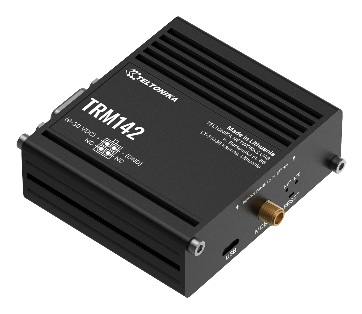 Teltonika TRM142, Modem voor mobiele netwerken, Zwart, Aluminium, DIN-rail/wandmontage, Industrieel, Netwerk, Stroom