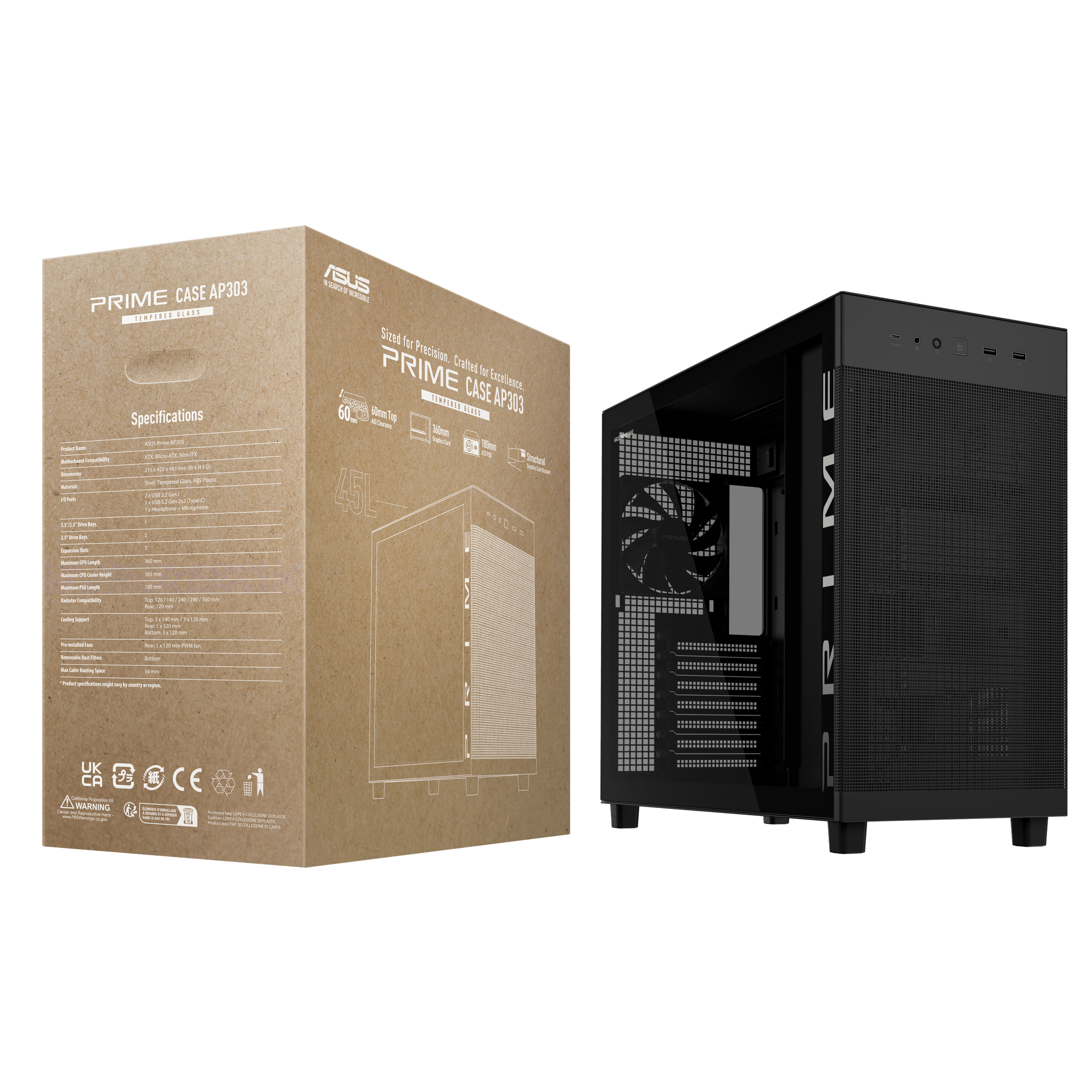 ASUS PRIME AP303 TG Black, PC, Zwart, micro ATX, Mini-ITX, ATX, 16,5 cm, 36 cm, 18 cm