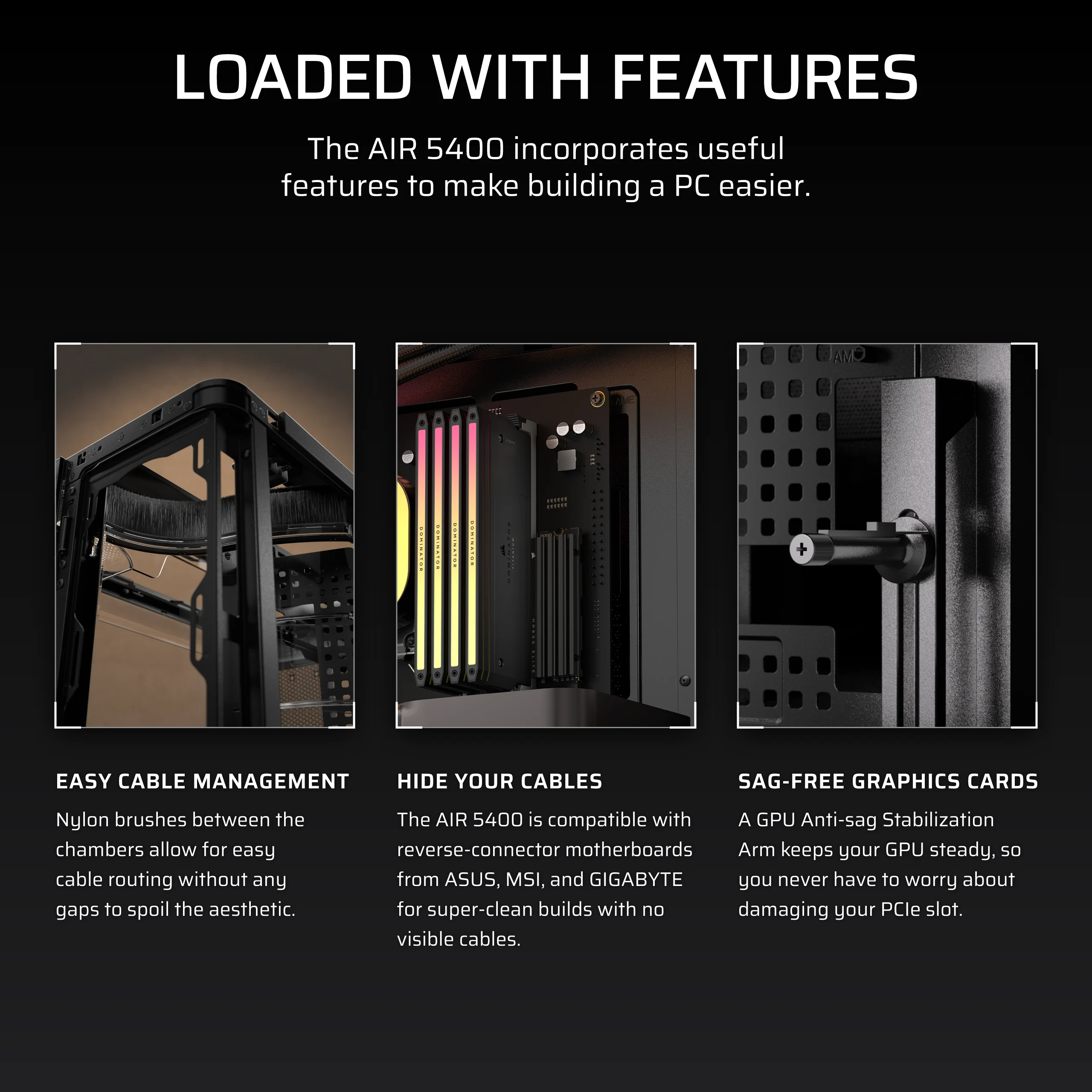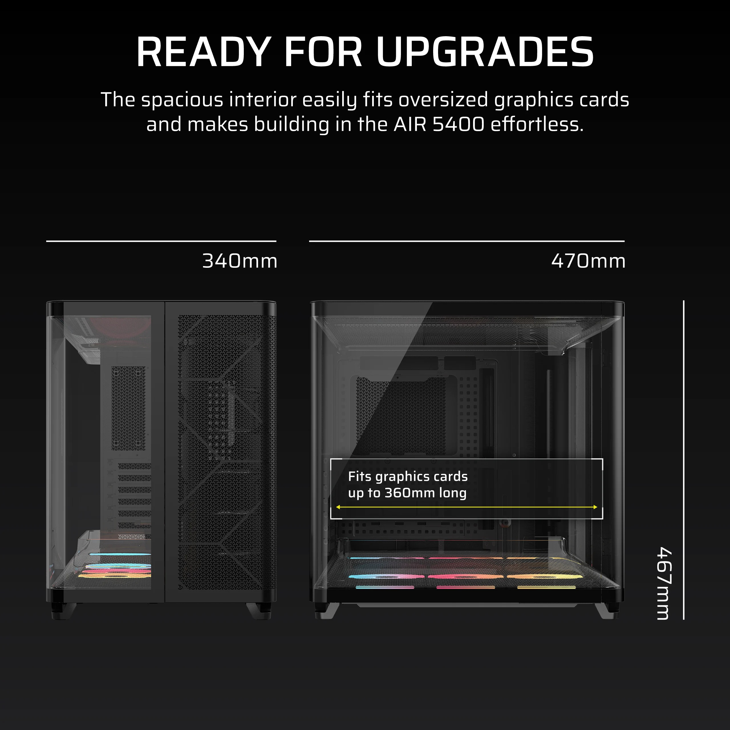 Corsair AIR 5400 LX-R RGB iCUE LINK. Vormfactor: Midi Tower, Soort: PC, Kleur van het product: Zwart. Ondersteunde vormfactoren stroomvoorziening: ATX. Voorste ventilators ondersteunende diameters: 120 mm, Achterkant ventilators ondersteunende diameters: 120 mm, Bovenste ventilators ondersteunende diameters: 120 mm. Ondersteunde HDD-groottes: 3.5", SSD-vormfactor: 2.5". Breedte: 340 mm, Diepte: 470 mm, Hoogte: 467 mm