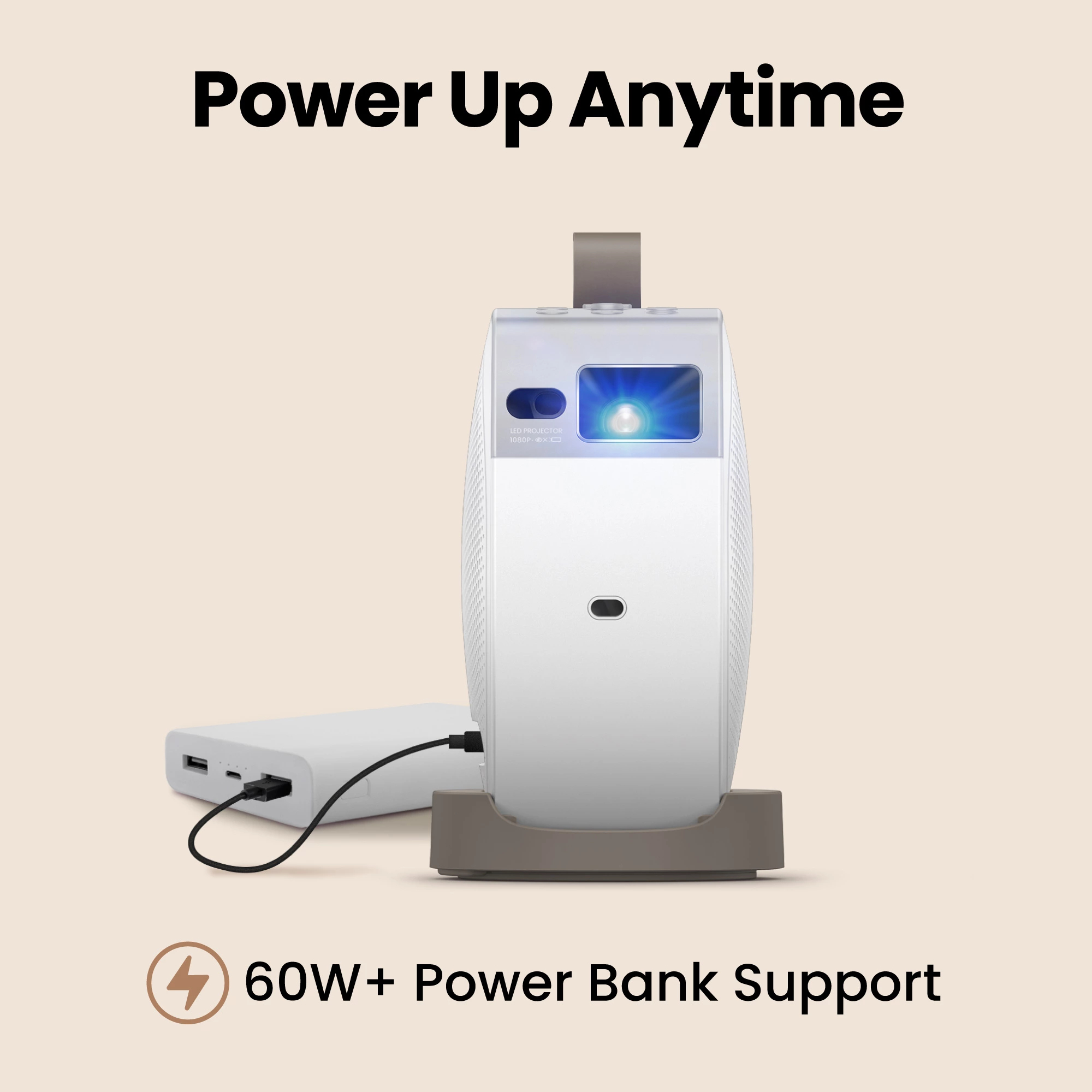 Sluit een USB-C powerbank (60W of hoger) aan voor directe stroom en grootbeeldentertainment, waar je ook bent—from tuinfeestjes tot buitenavonturen. *Let op: Powerbanks van 60–90W ondersteunen 50% helderheid; met meer dan 90W geniet je van volledige helderheid.