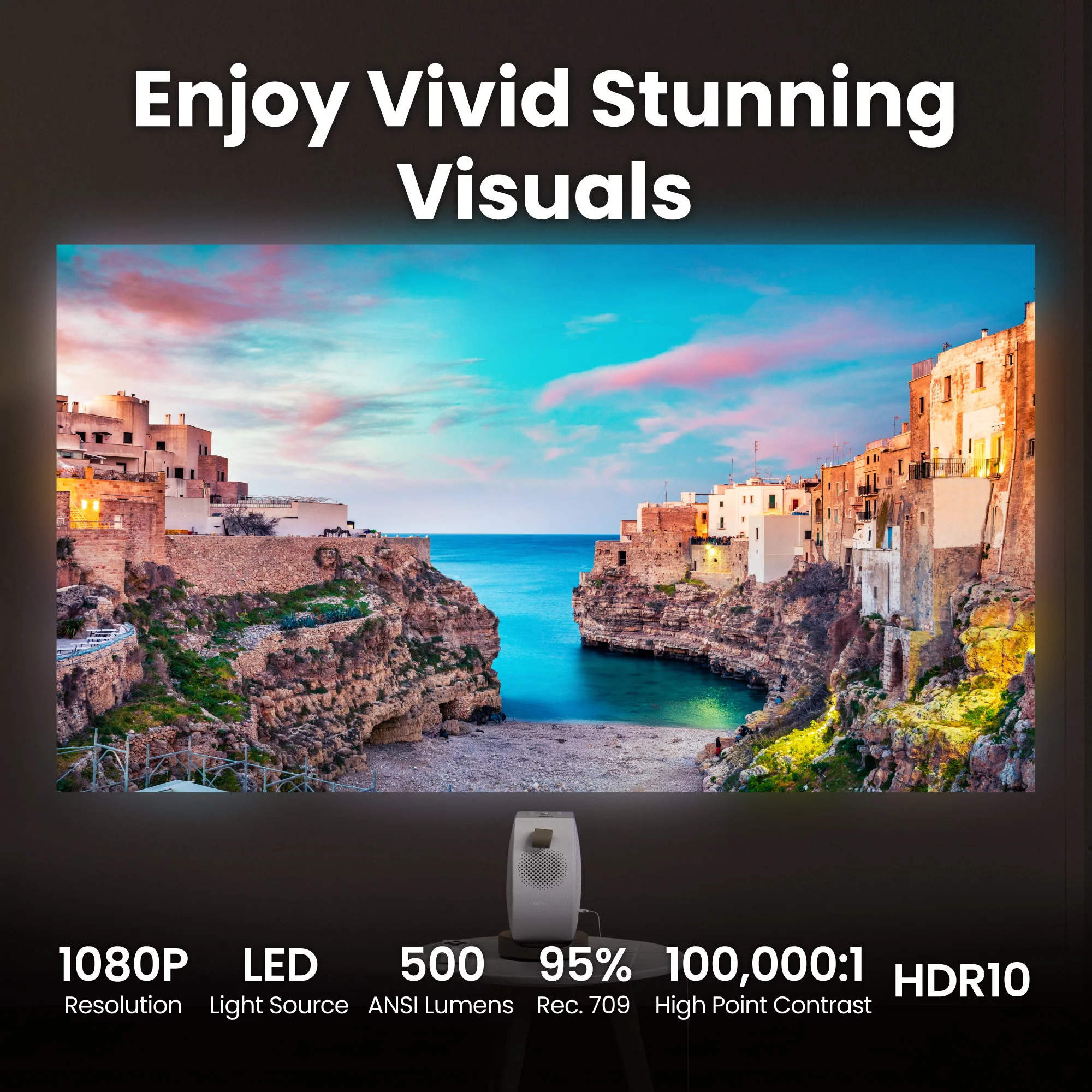 Geniet van prachtige beelden met 95% Rec. 709 kleurnauwkeurigheid en 500 ANSI-lumen helderheid, aangedreven door BenQ CinematicColor technologie voor geoptimaliseerde HDR10- en HLG-content.