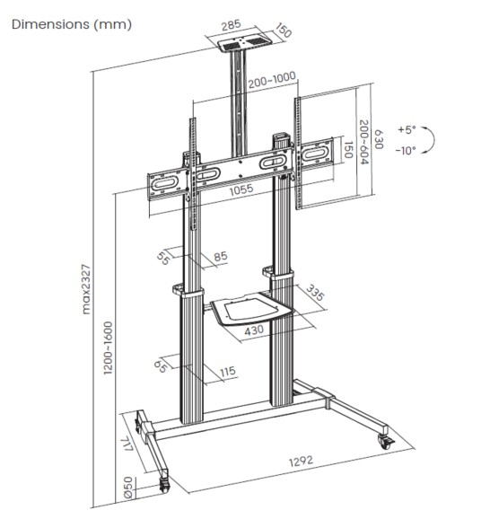 Equip 60“-100” Heavy Duty Mobiele Vloersteun, 2,54 m (100"), 200 x 200 mm, 1000 x 600 mm, -10 - 5°, Aluminium, Kunststof, Roestvrijstaal, Zwart