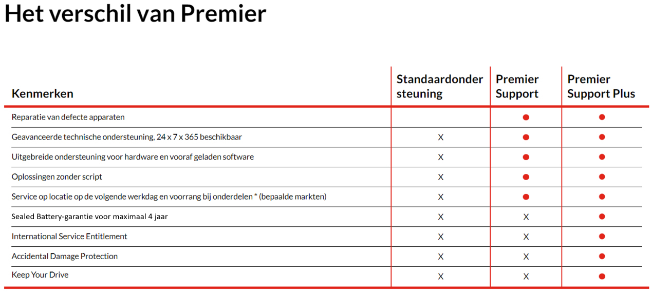 Premier Support: VIP-dekking voor zowel IT-personeel als eindgebruikers die de productiviteit verhoogt met toegang tot eersteklas probleemoplossing. 24x7x365 beschikbaar met prioriteit bij onderdelen met respons op de volgende werkdag en arbeid op locatie voor reparaties.(2)