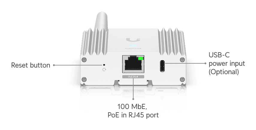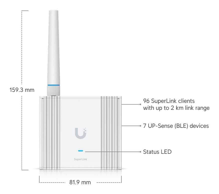 Ubiquiti SuperLink. Kleur van het product: Wit, Behuizingsmateriaal: Polycarbonaat (PC), Montagewijze: DIN-rail/wandmontage. Soort antenne: Extern, Antenne versterkingsniveau (max): 3 dBi. Ethernet LAN, data-overdrachtsnelheden: 10,100 Mbit/s, Bekabelingstechnologie: 10/100Base-T(X). Vermogensverbruik (max): 3,4 W. Breedte: 81,9 mm, Diepte: 26 mm, Hoogte: 159,3 mm