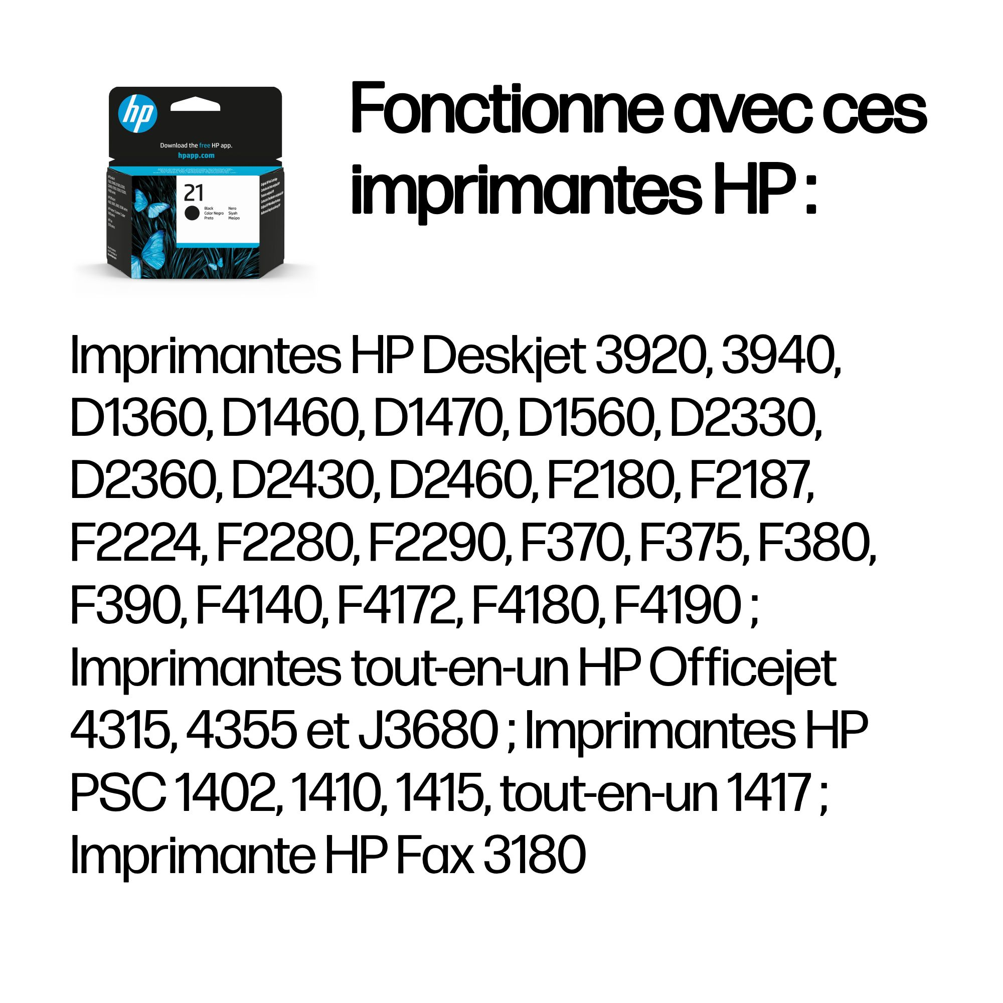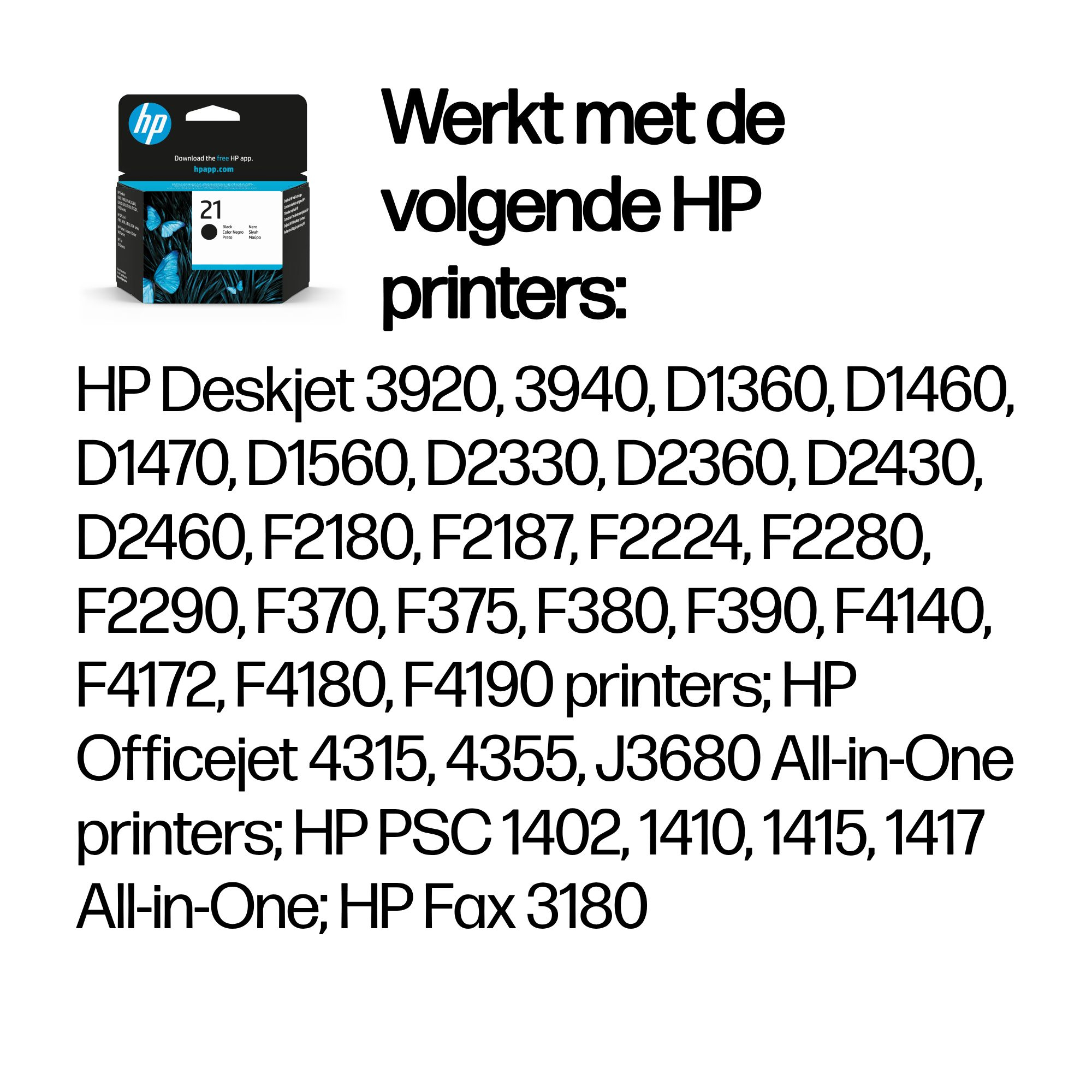 HP 21 inktcartridges produceren professionele documenten met zwarte tekst van laserkwaliteit. HP inktcartridges zijn ontworpen om samen met uw HP printer de beste resultaten te produceren.