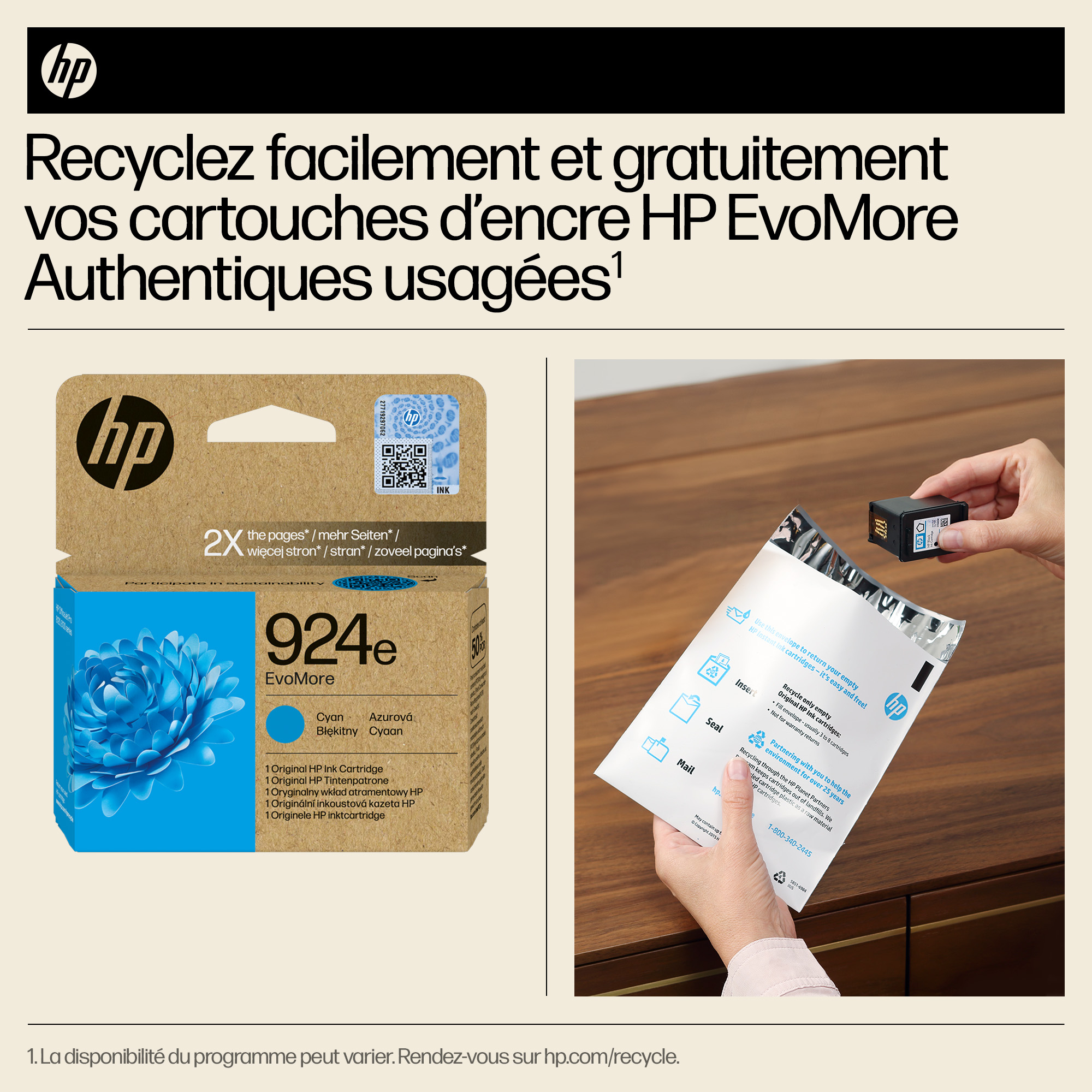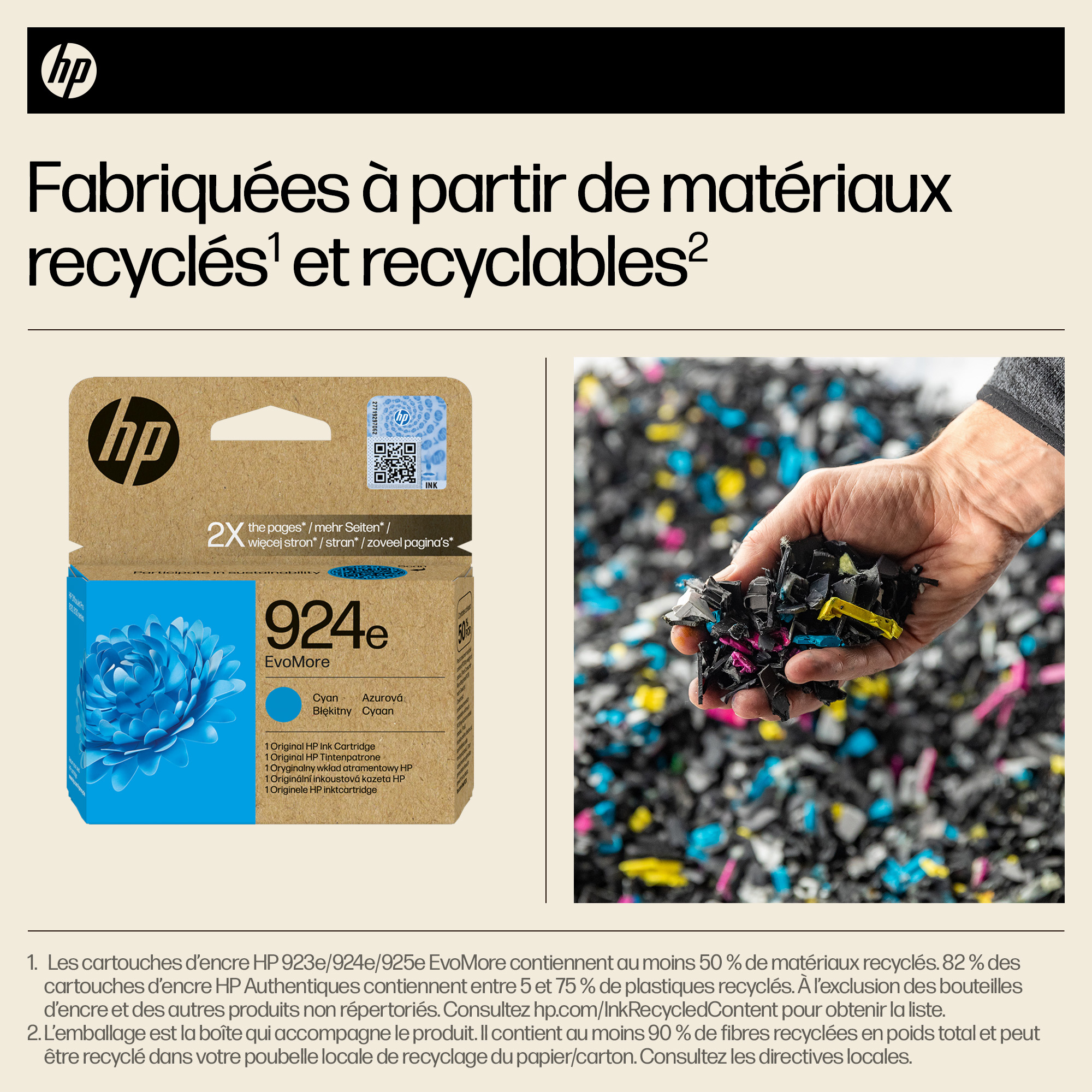Originele HP EvoMore-inktcartridges, die ontworpen zijn om twee keer zoveel pagina's te printen als standaardcartridges,[3] zorgen voor een lagere CO₂-uitstoot[2] en kunnen eenvoudig worden gerecycled[4]. Hierbij komen hoge prestaties, kwaliteit en duurzaamheidskenmerken samen.