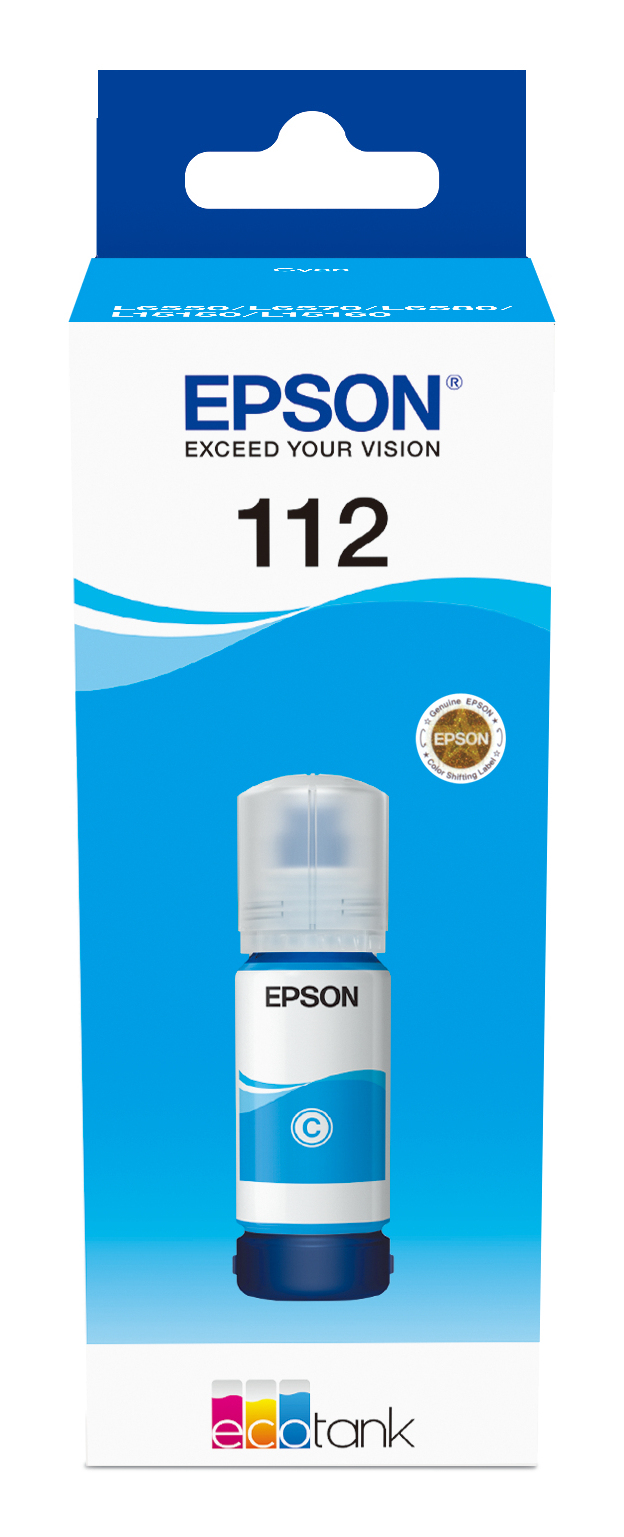Epson EcoTank 112. Soort: Origineel, Printkleuren: Cyaan Pigment, Merkcompatibiliteit: Epson. Aantal per verpakking: 1 stuk(s), Type verpakking: Doos