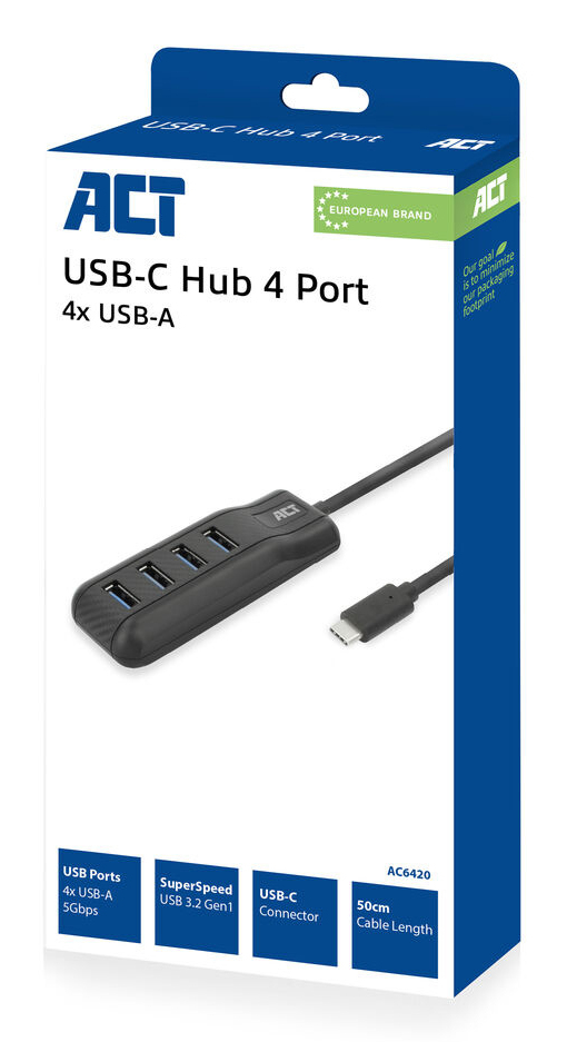 De ACT AC6420 USB-C Hub voegt 4 USB-A poorten toe aan je laptop of computer met USB-C. De hub is compatibel met de USB 3.2 Gen1 standaard, ook wel USB 3.0 genoemd, met een overdrachtssnelheid van SuperSpeed USB 5Gbps. Door de handige kabel van 50cm bungelt de hub niet aan je laptop wanneer deze op een standaard staat of op een bureau is geplaatst.